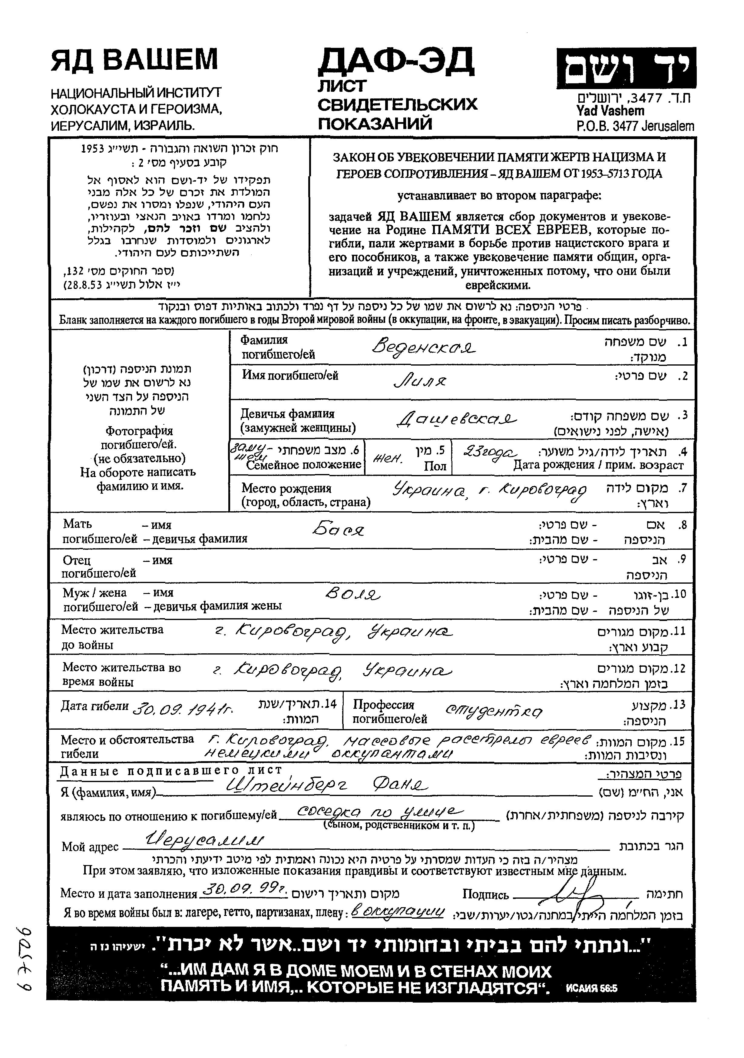 Lilya Vedenski, geb. Dashevski wurde im Jahr 1918 in Kirovograd, Ukraine (UdSSR) geboren. Sie war die Tochter von Basya. Sie war Student und mit Volya Verheiratet. Vor dem Zweiten Weltkrieg lebte sie in Kirovograd, Ukraine (UdSSR). Während des Krieges war sie in Kirovograd, Ukraine (UdSSR).