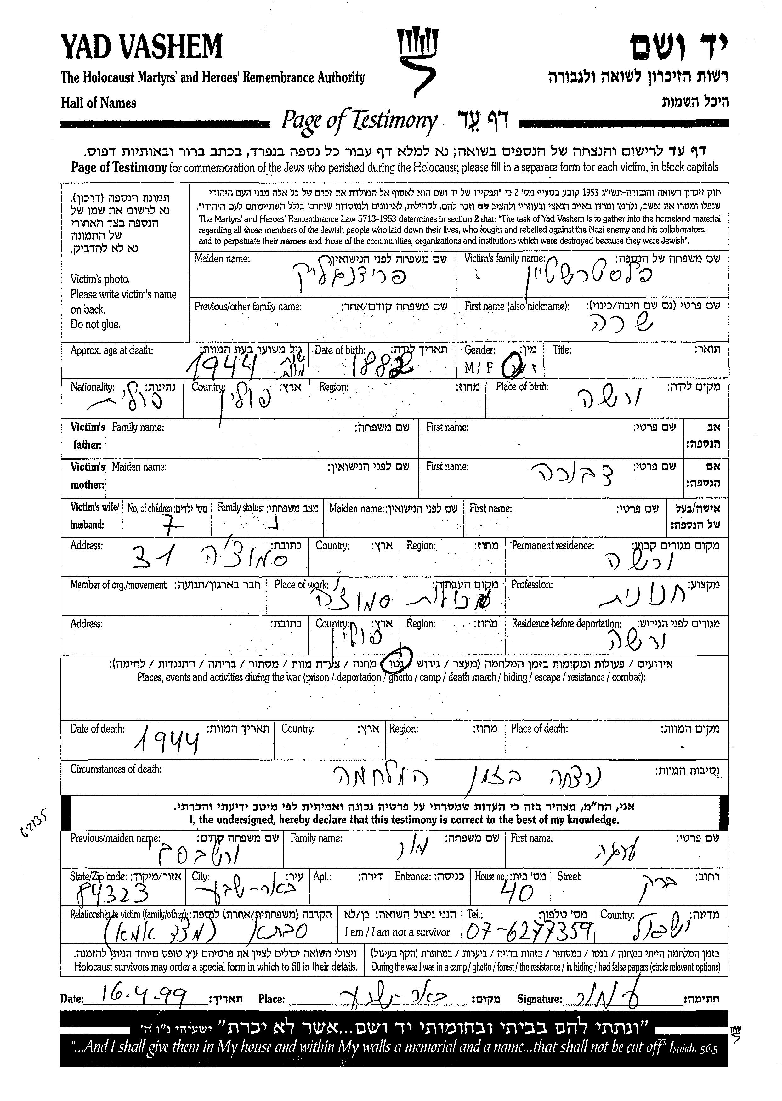 Sara Flastershtein, geb. Fraidenglik wurde im Jahr 1882 in Warsaw, Polen geboren. Sie war die Tochter von Dvora. Sie war Lebensmittelhändler/-in und Verheiratet. Vor dem Zweiten Weltkrieg lebte sie in Warsaw, Polen. Während des Krieges war sie in Warsaw, Polen.