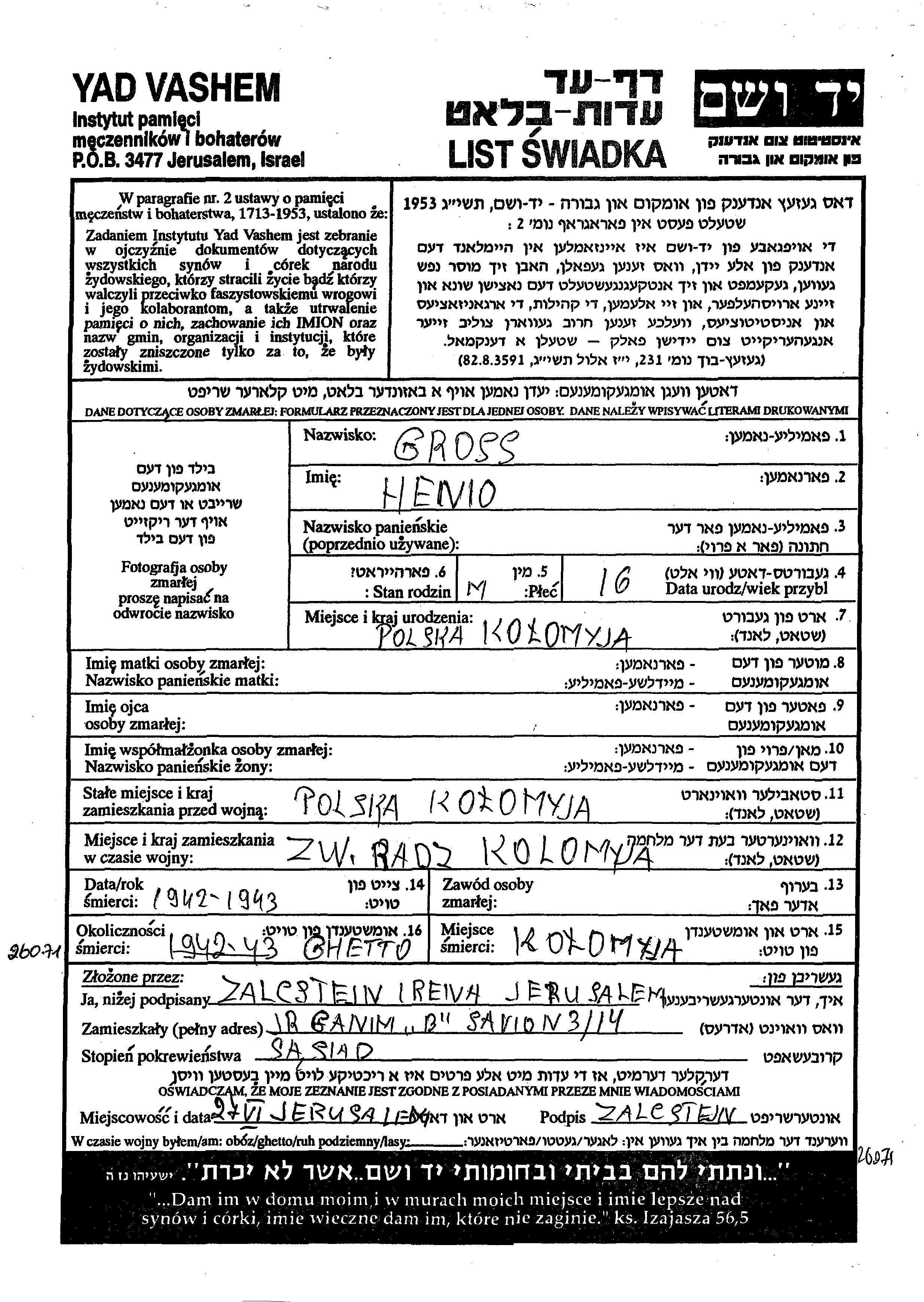 Henio wurde in der Schoah ermordet. Todesort: Kolomyja, Polen im Jahr 1942.