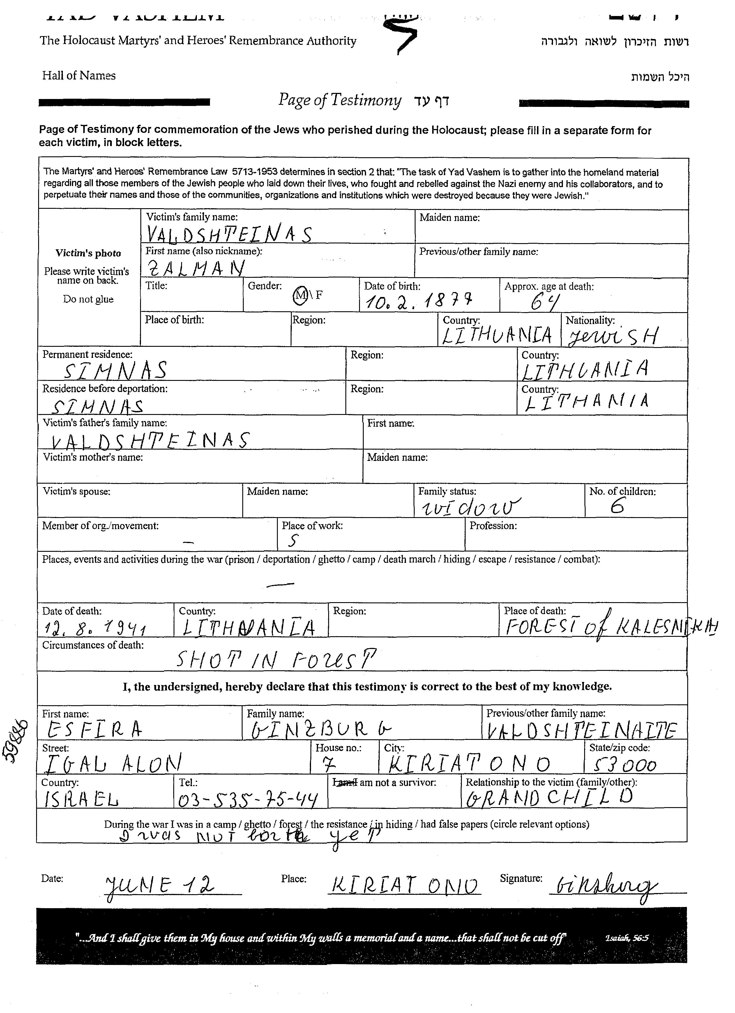 Zalman Valdshteinas wurde im Jahr 1877 in Litauen geboren. Er war Witwe. Vor dem Zweiten Weltkrieg lebte er in Simnas, Litauen. Während des Krieges war er in Simnas, Litauen.