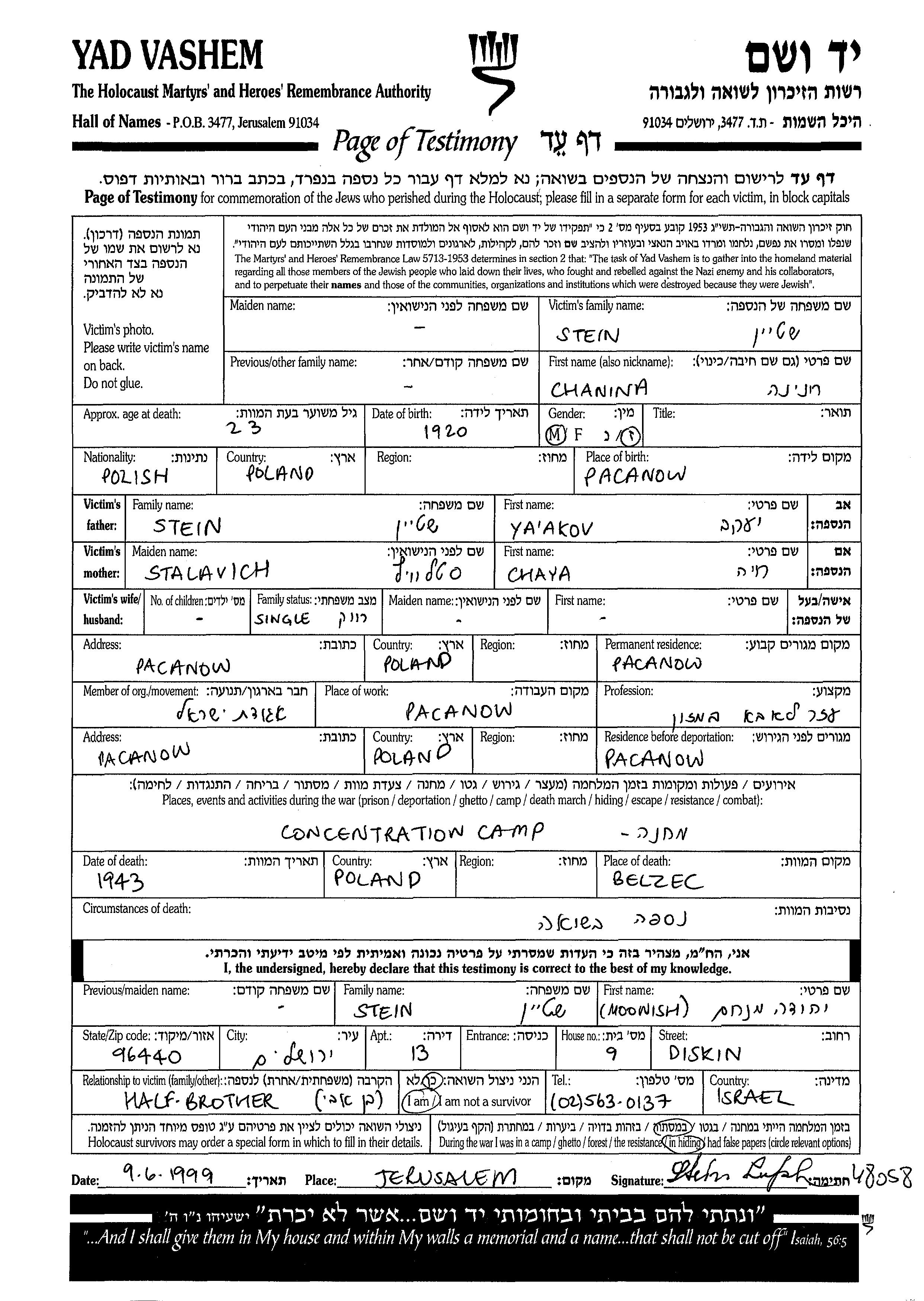 Chanina Stein wurde im Jahr 1920 in Pacanow, Polen geboren. Er war der Sohn von Yaakov und Chaya. Er war Ledig. Vor dem Zweiten Weltkrieg lebte er in Pacanow, Polen. Während des Krieges war er in Pacanow, Polen.