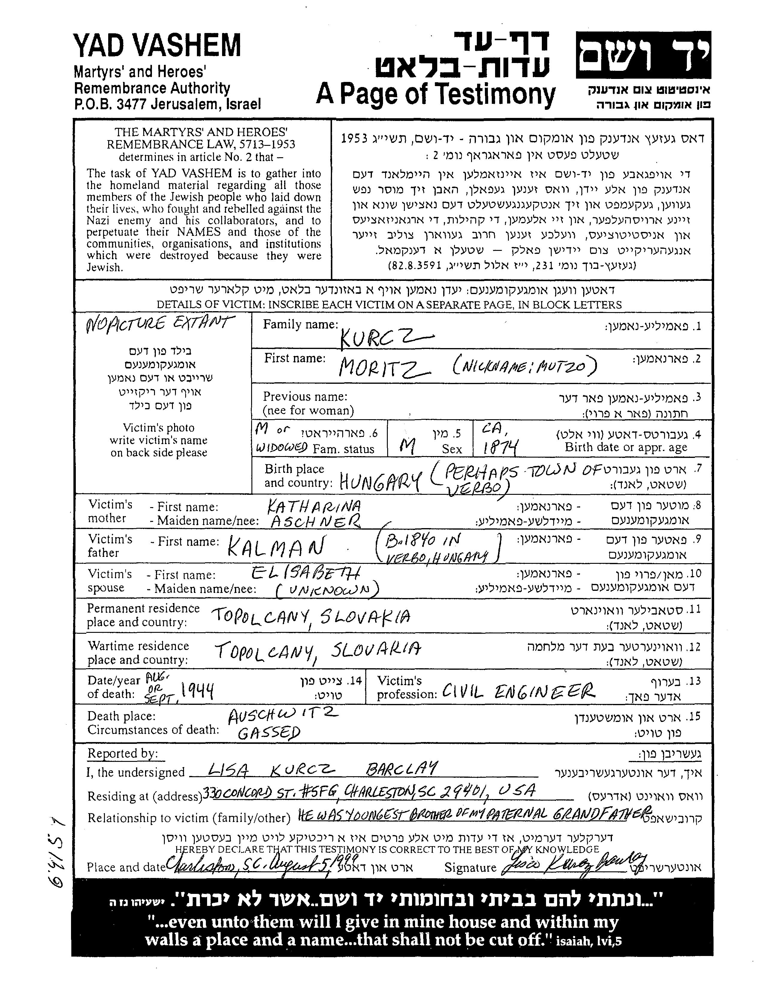 Moritz Kurcz wurde im Jahr 1874 in Verbo, Tschechoslowakei geboren. Er war der Sohn von Kalman und Katharina. Er war Bauingenieur und mit Elisabeth Witwe. Vor dem Zweiten Weltkrieg lebte er in Topolcany, Tschechoslowakei. Während des Krieges war er in Topolcany, Tschechoslowakei.