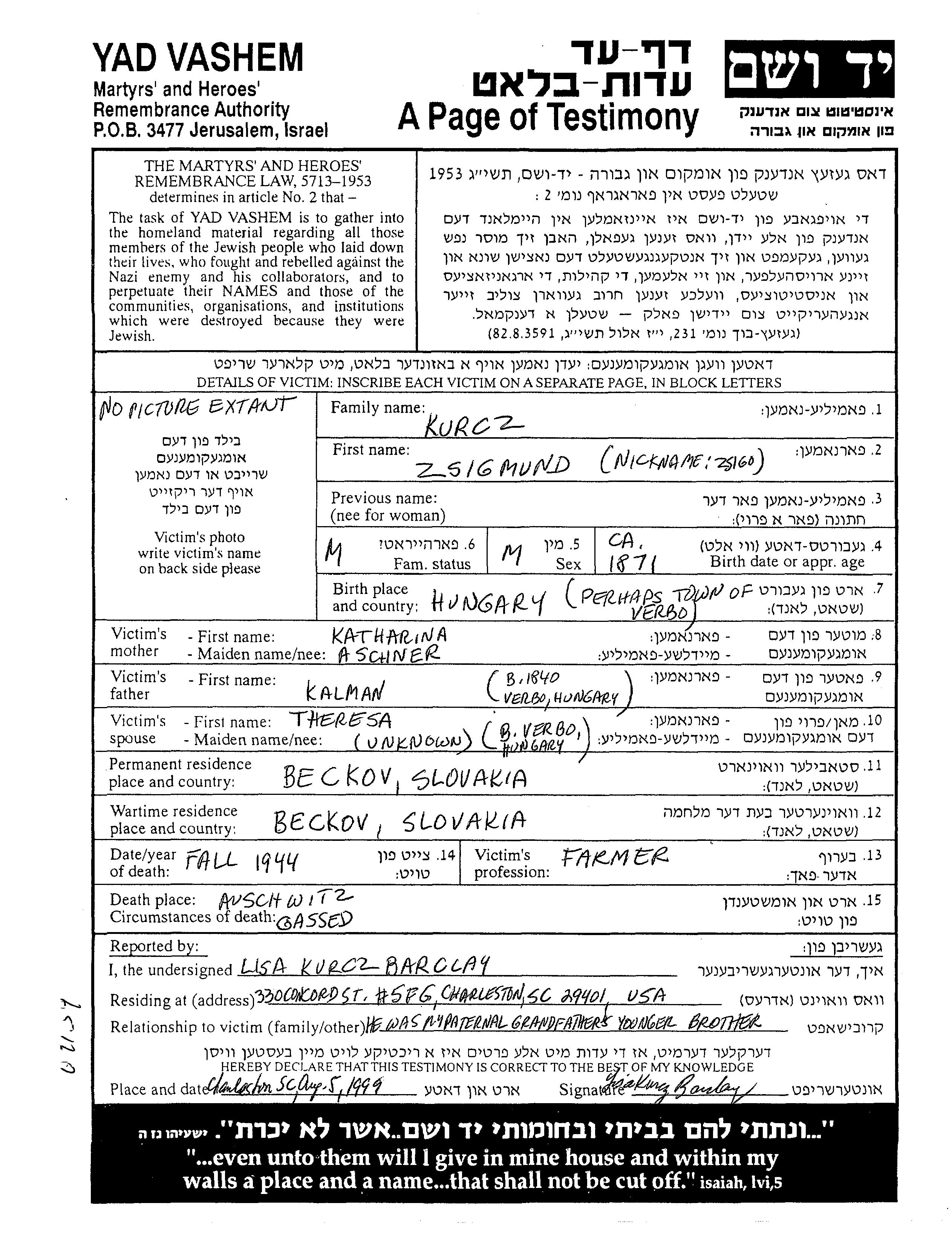 Zsigmund Kurcz wurde im Jahr 1871 in Ungarn geboren. Er war der Sohn von Kalman und Katharina. Er war Landwirt und mit Theresa Verheiratet. Vor dem Zweiten Weltkrieg lebte er in Beckov, Tschechoslowakei. Während des Krieges war er in Beckov, Tschechoslowakei.