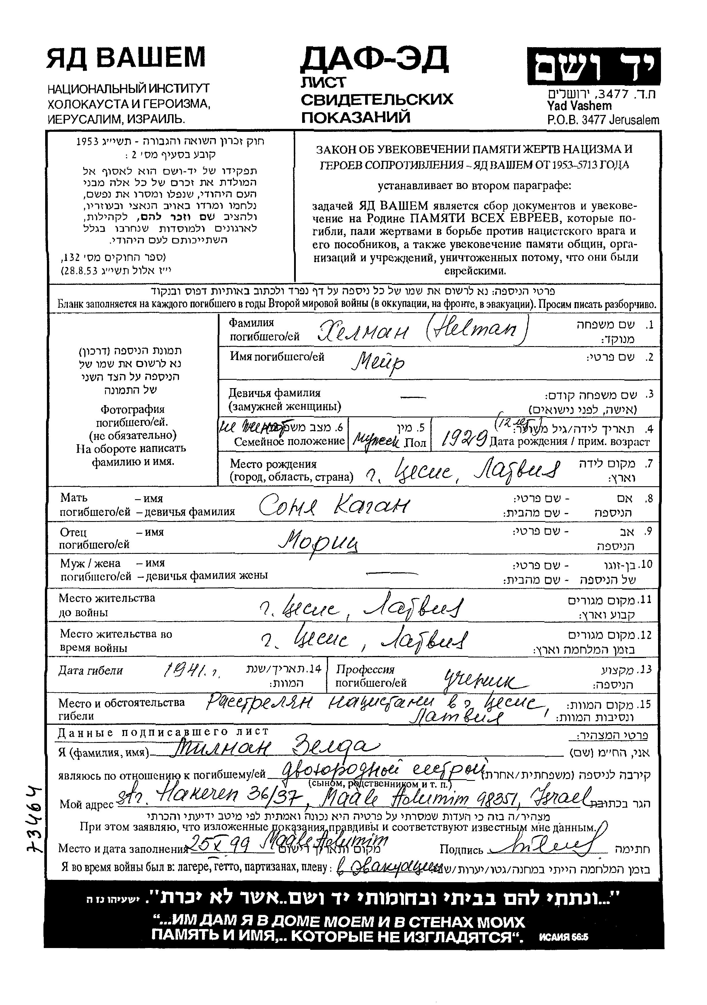 Meyr Khelman wurde im Jahr 1929 in Cesis, Lettland geboren. Er war der Sohn von Moritz und Sonya, geb. Kagan. Er war Schüler/-in und Kind. Vor dem Zweiten Weltkrieg lebte er in Cesis, Lettland. Während des Krieges war er in Cesis, Lettland.