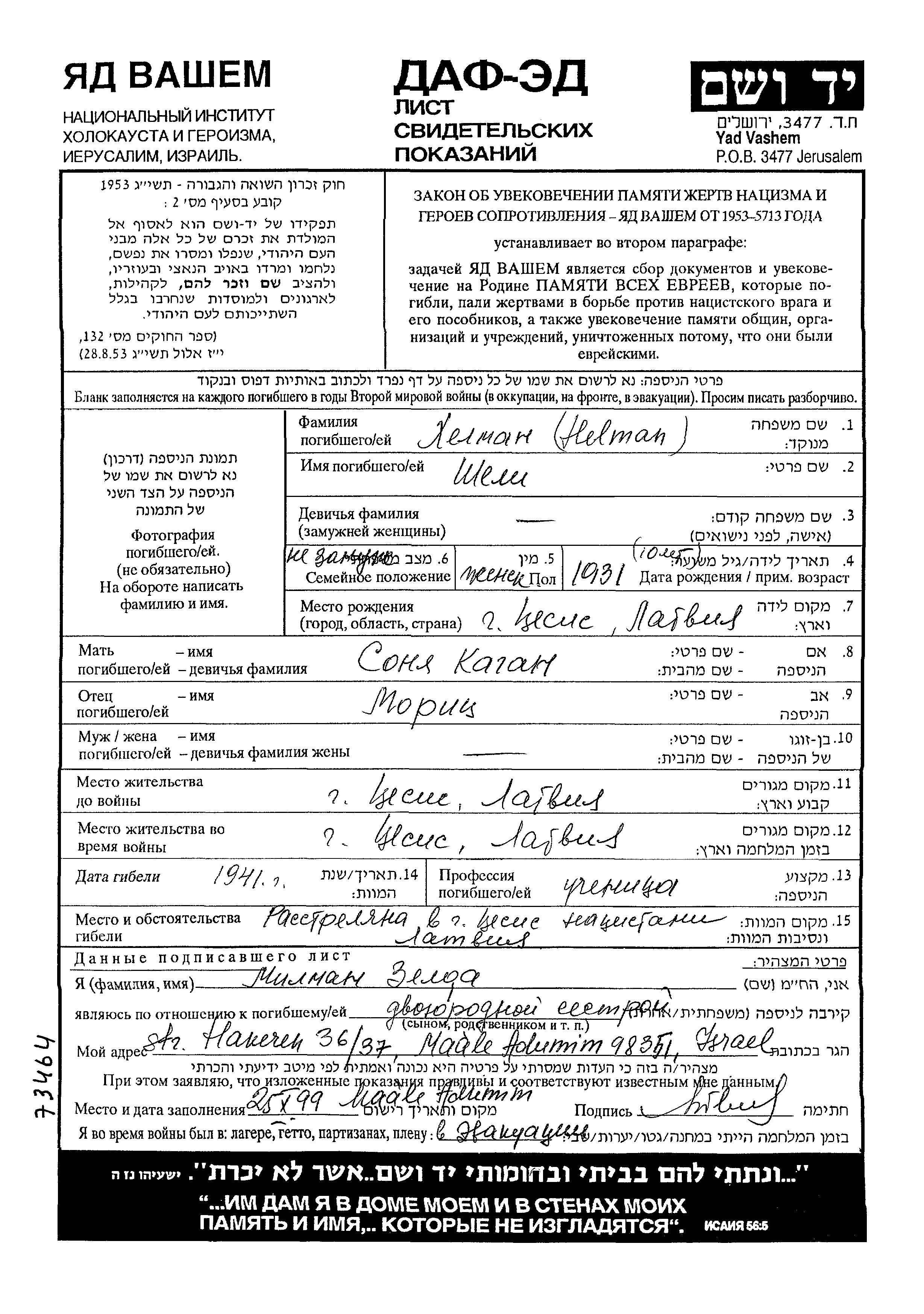 Sheli Khelman wurde im Jahr 1931 in Cesis, Lettland geboren. Sie war die Tochter von Moritz und Sonya, geb. Kagan. Sie war Schüler/-in und Kind. Vor dem Zweiten Weltkrieg lebte sie in Cesis, Lettland. Während des Krieges war sie in Cesis, Lettland.
