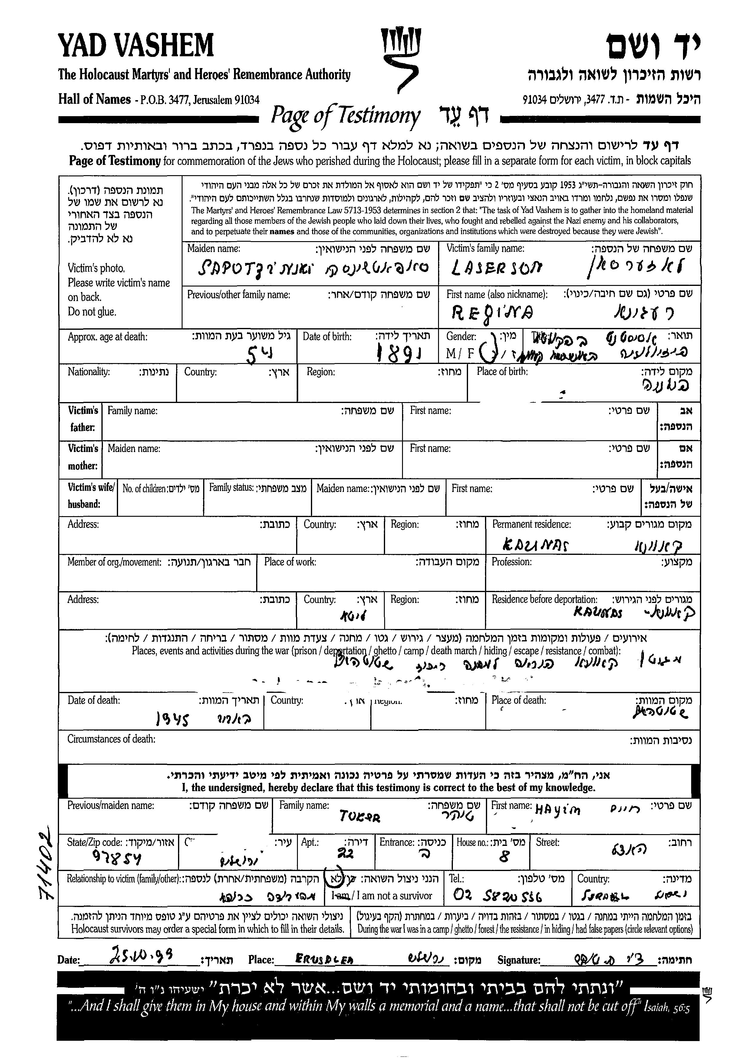 Regina Leizerson, geb. Sapotzinski wurde im Jahr 1891 in Polen geboren. Vor dem Zweiten Weltkrieg lebte sie in Kaunas, Litauen. Während des Krieges war sie in Kaunas, Litauen.