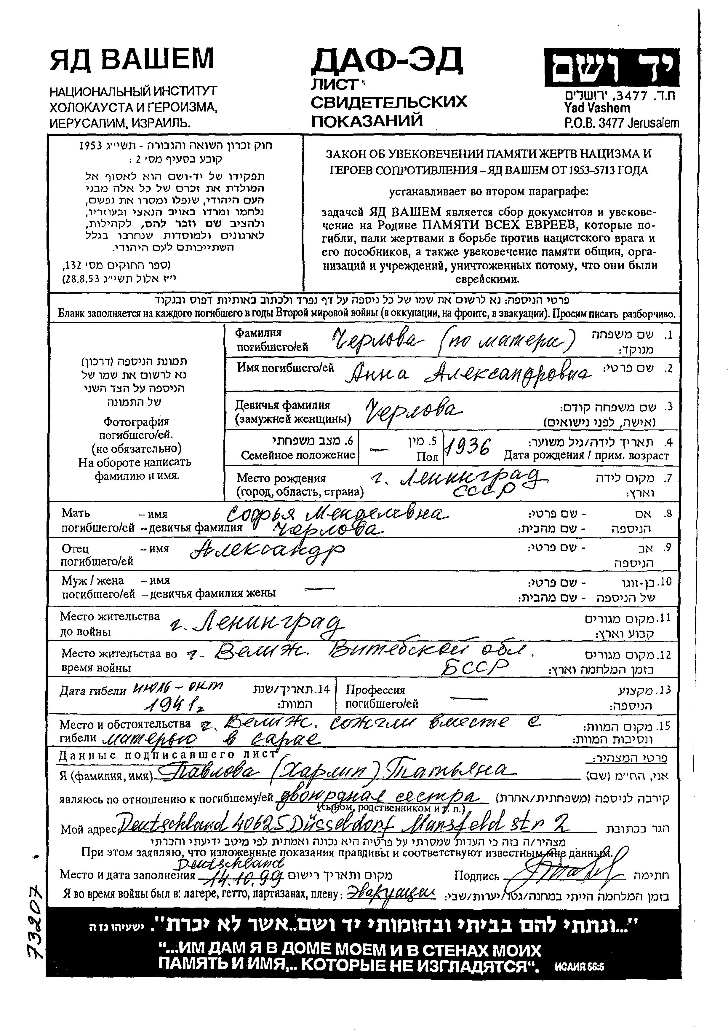 Anna wurde in der Schoah ermordet. Todesort: Velizh, Russland (UdSSR) im Jahr 1941.