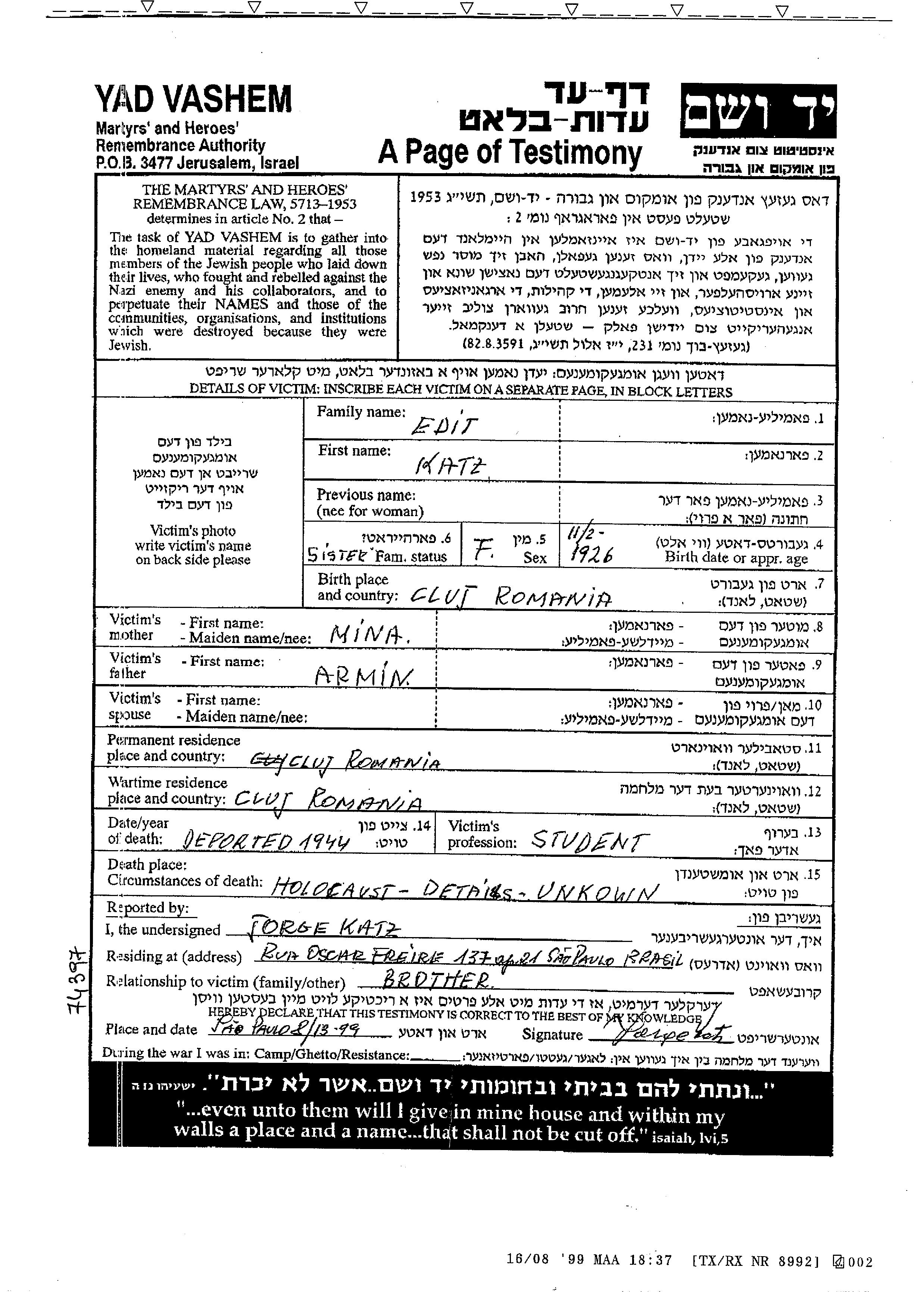 Edit wurde in der Schoah ermordet. Todesort: Cluj, Rumänien im Jahr 1944.