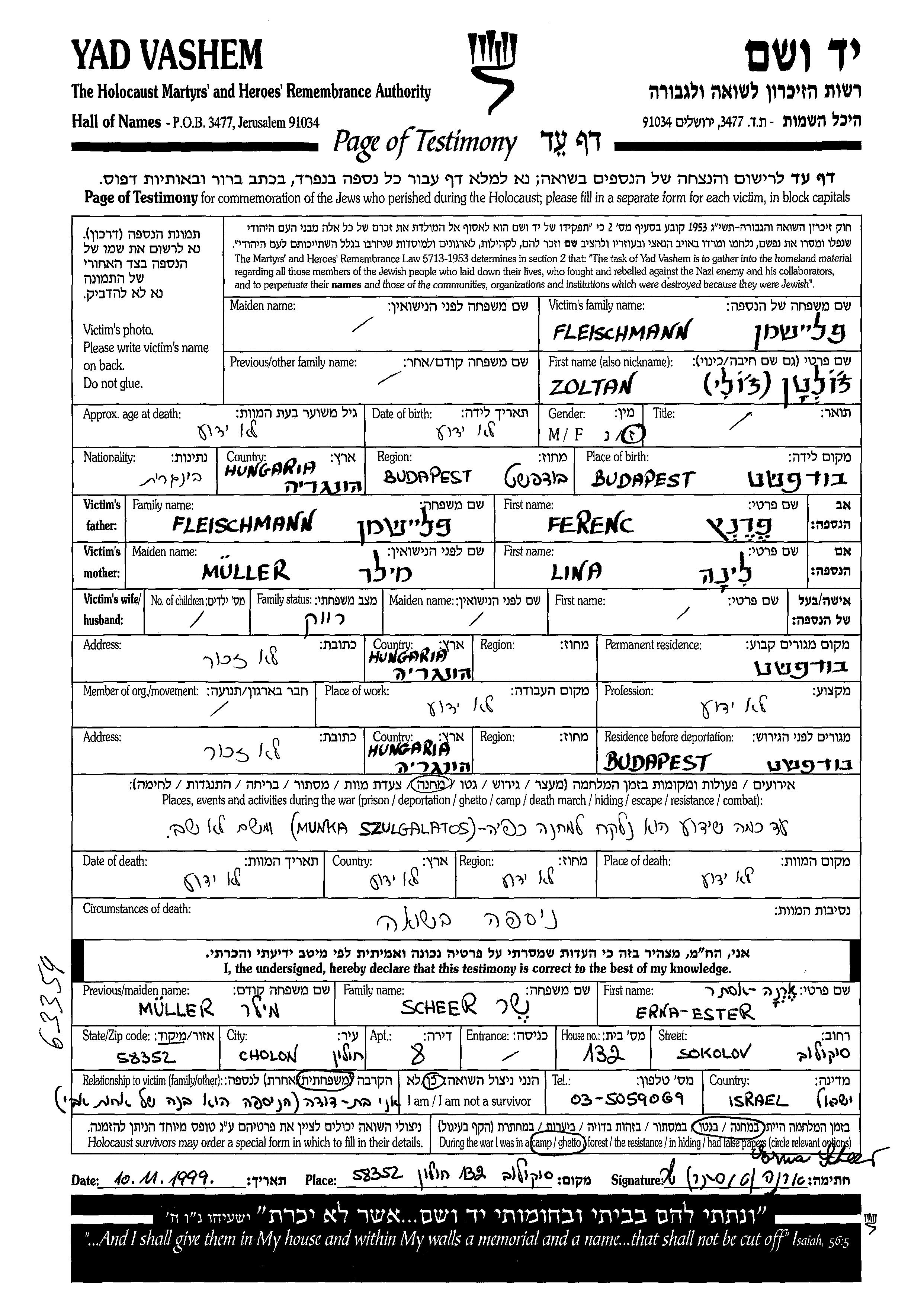 Zoltan Fleischmann wurde in Budapest, Ungarn geboren. Er war der Sohn von Ferentz und Lina. Er war Ledig. Vor dem Zweiten Weltkrieg lebte er in Budapest, Ungarn. Während des Krieges war er in Budapest, Ungarn.