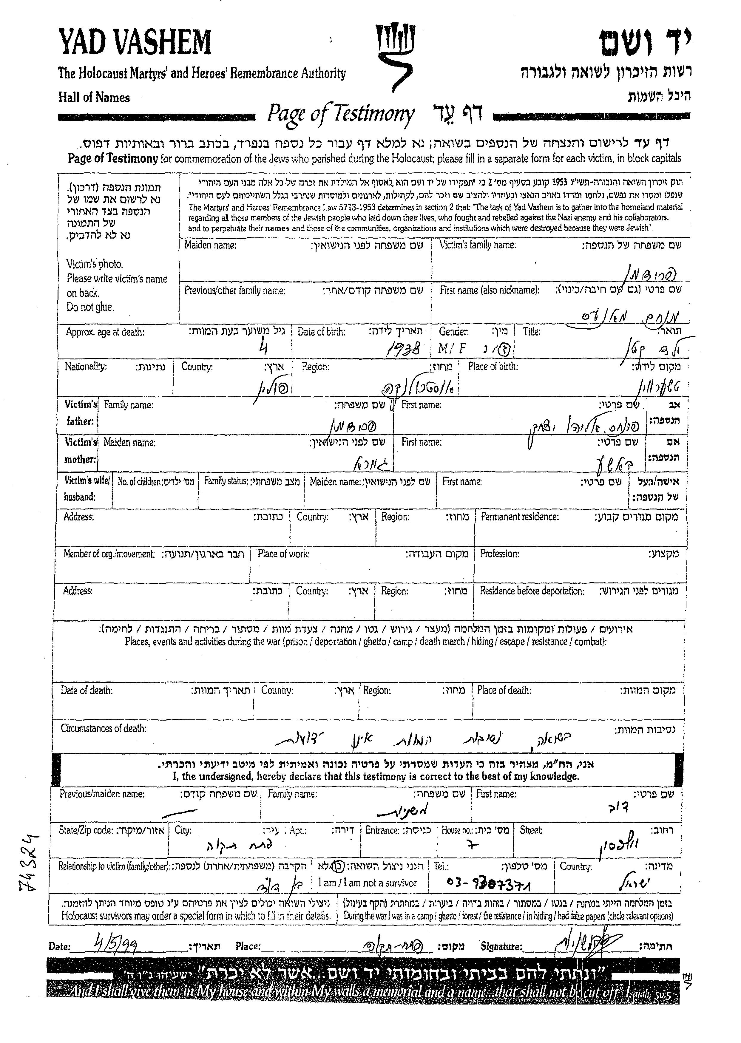 Menakhem Manes wurde in der Schoah ermordet.