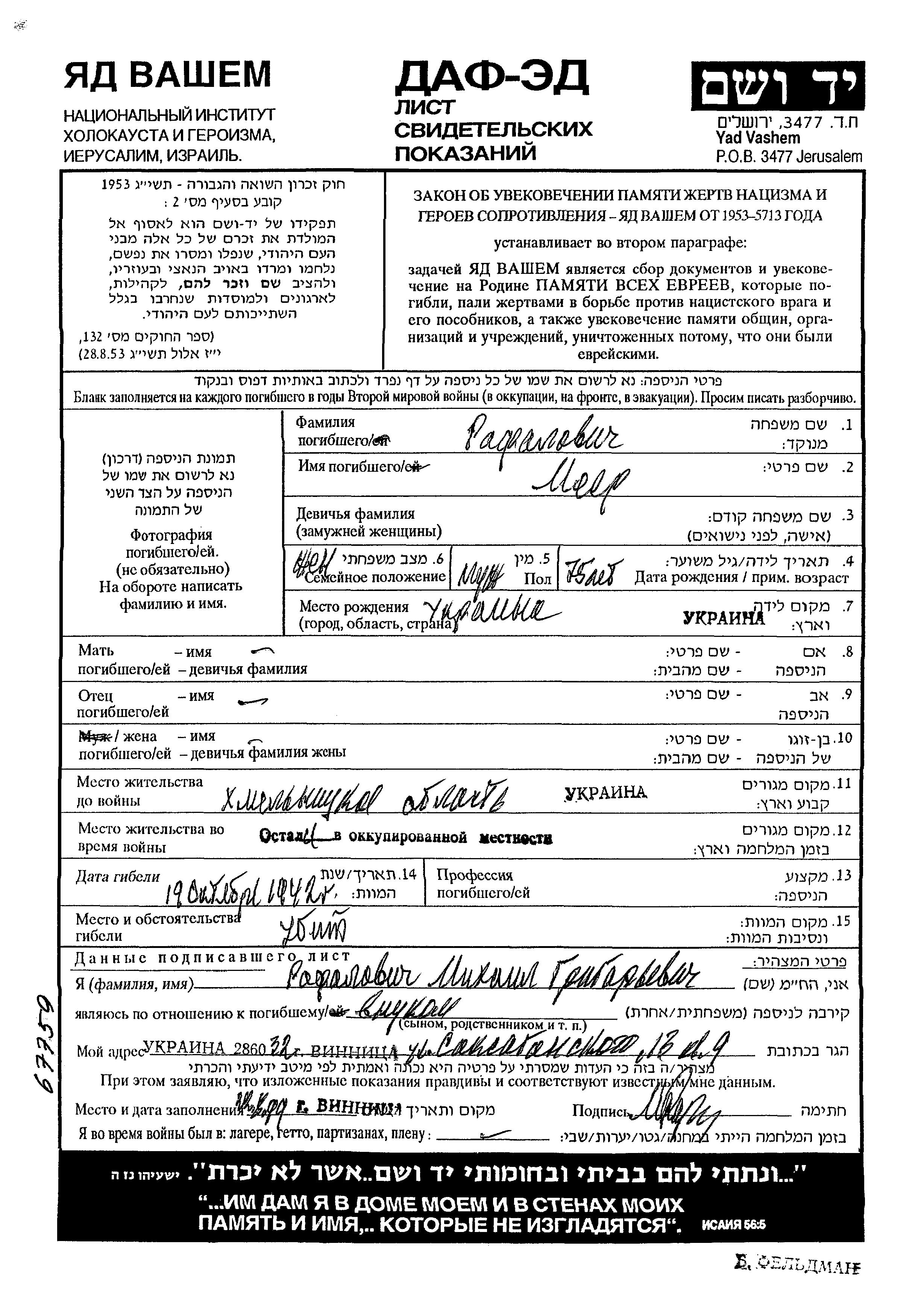 Meyer Rafalovich wurde in Ukraine (UdSSR) geboren. Er war Verheiratet. Vor dem Zweiten Weltkrieg lebte er in Kamenets Podolsk, Ukraine (UdSSR). Während des Krieges war er in Kamenets Podolsk, Ukraine (UdSSR).