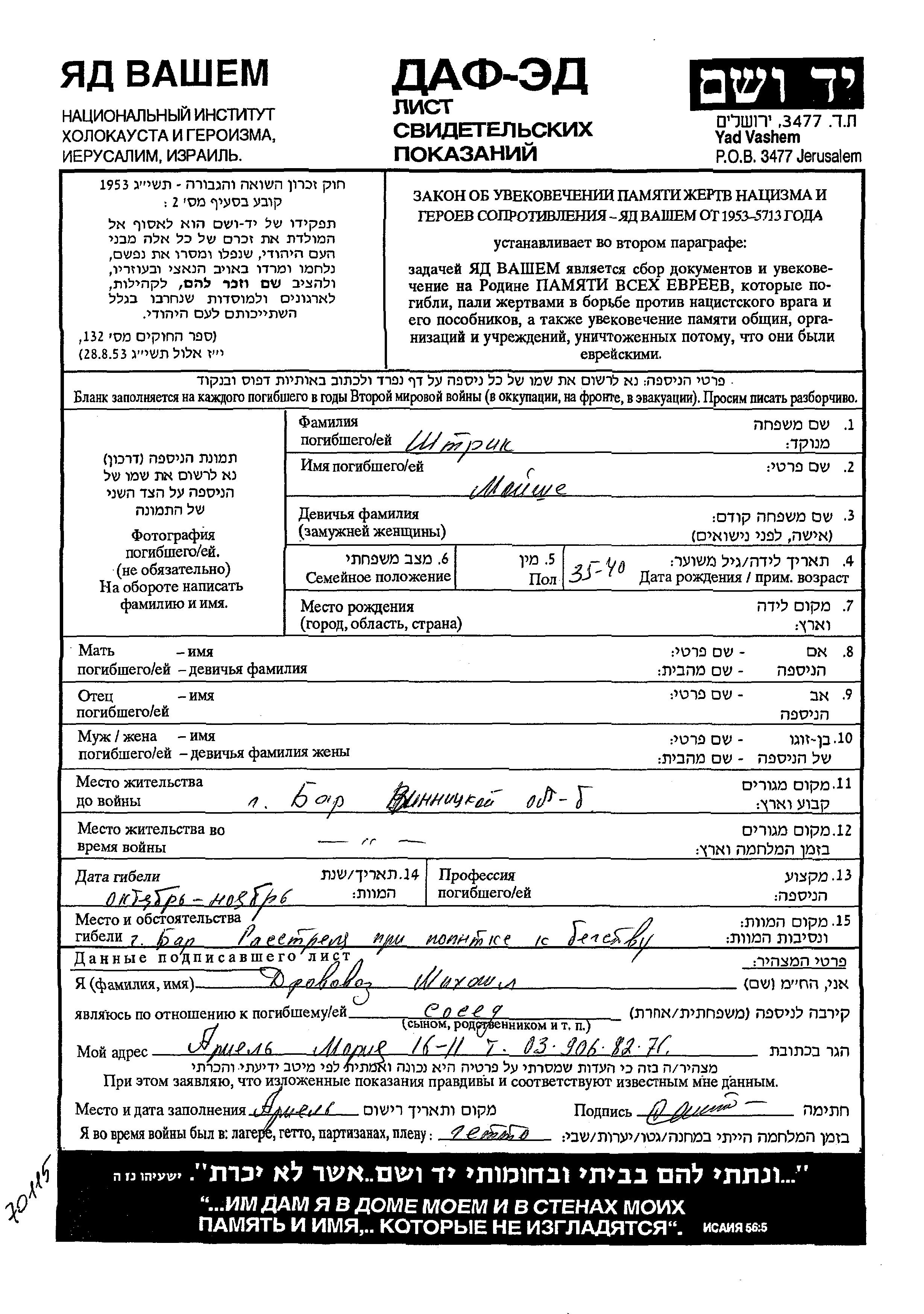 Moishe Shtrik. Vor dem Zweiten Weltkrieg lebte er in Bar, Ukraine (UdSSR). Während des Krieges war er in Bar, Ukraine (UdSSR).