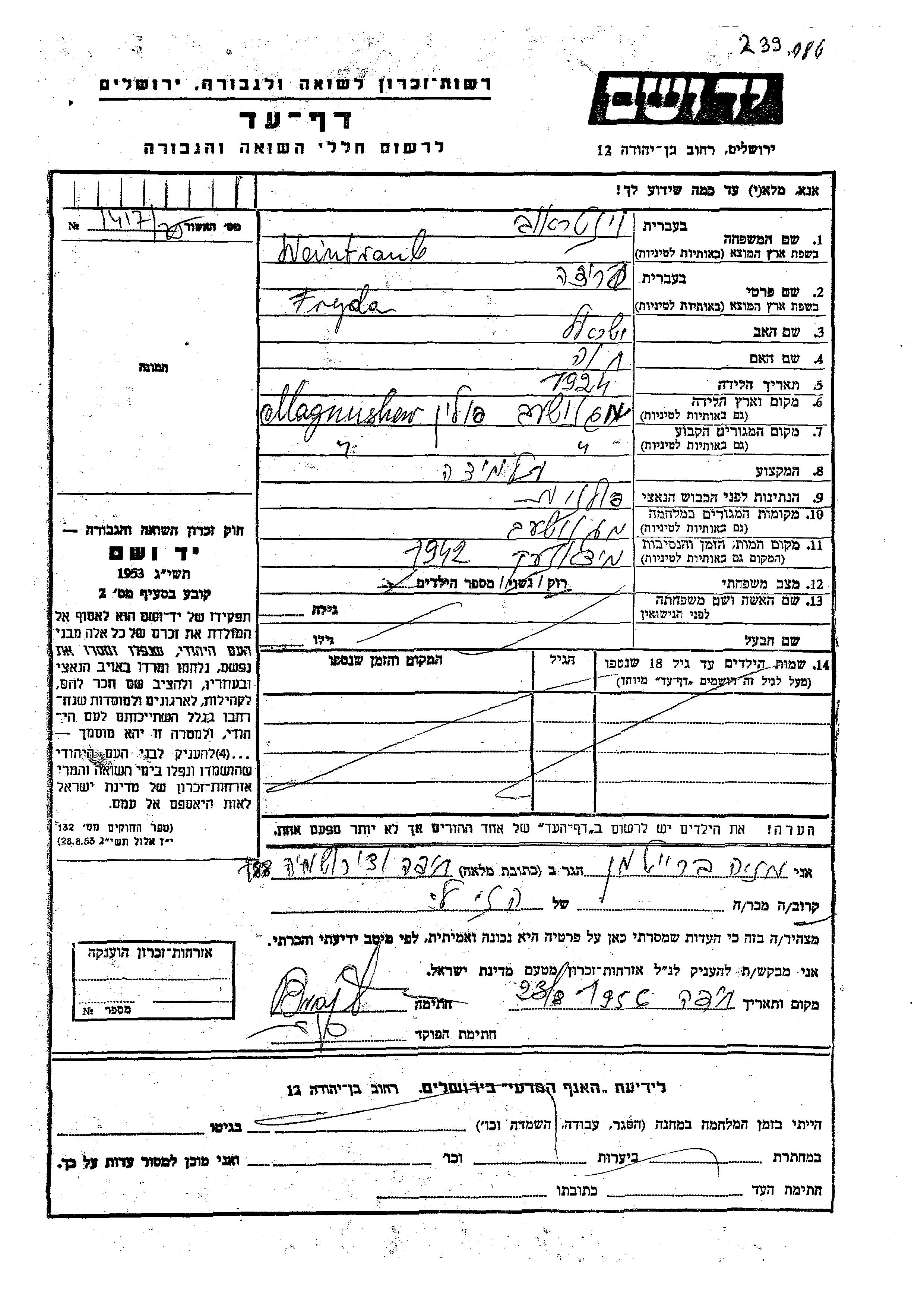 Fryda Weintraub wurde im Jahr 1924 in Magnashev, Polen geboren. Sie war die Tochter von Yisrael und Khava. Sie war Schüler/-in und Ledig. Vor dem Zweiten Weltkrieg lebte sie in Magnashev, Polen. Während des Krieges war sie in Magnashev, Polen.