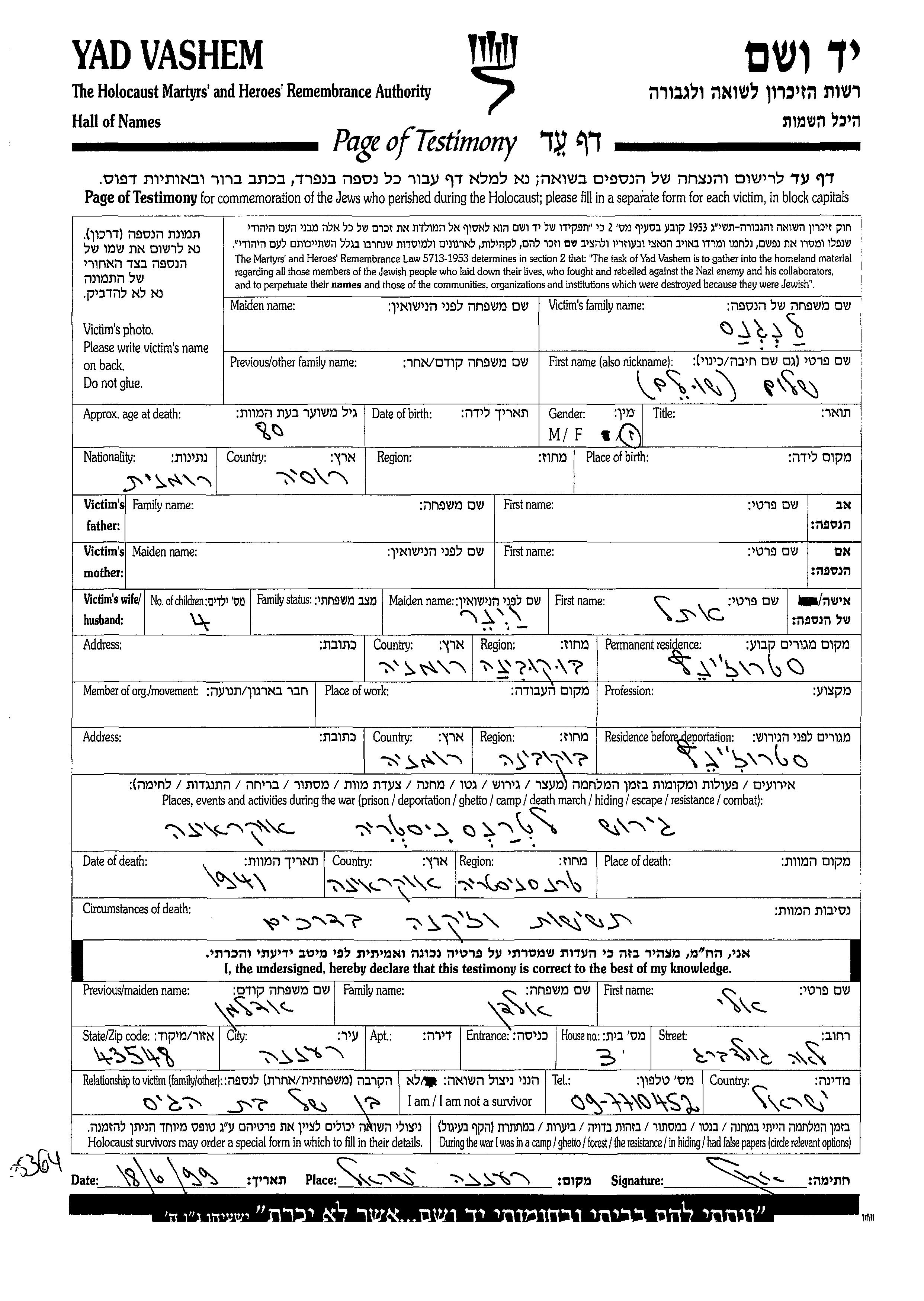 Shalom wurde in der Schoah ermordet. Todesort: Ukraine (UdSSR) im Jahr 1941.