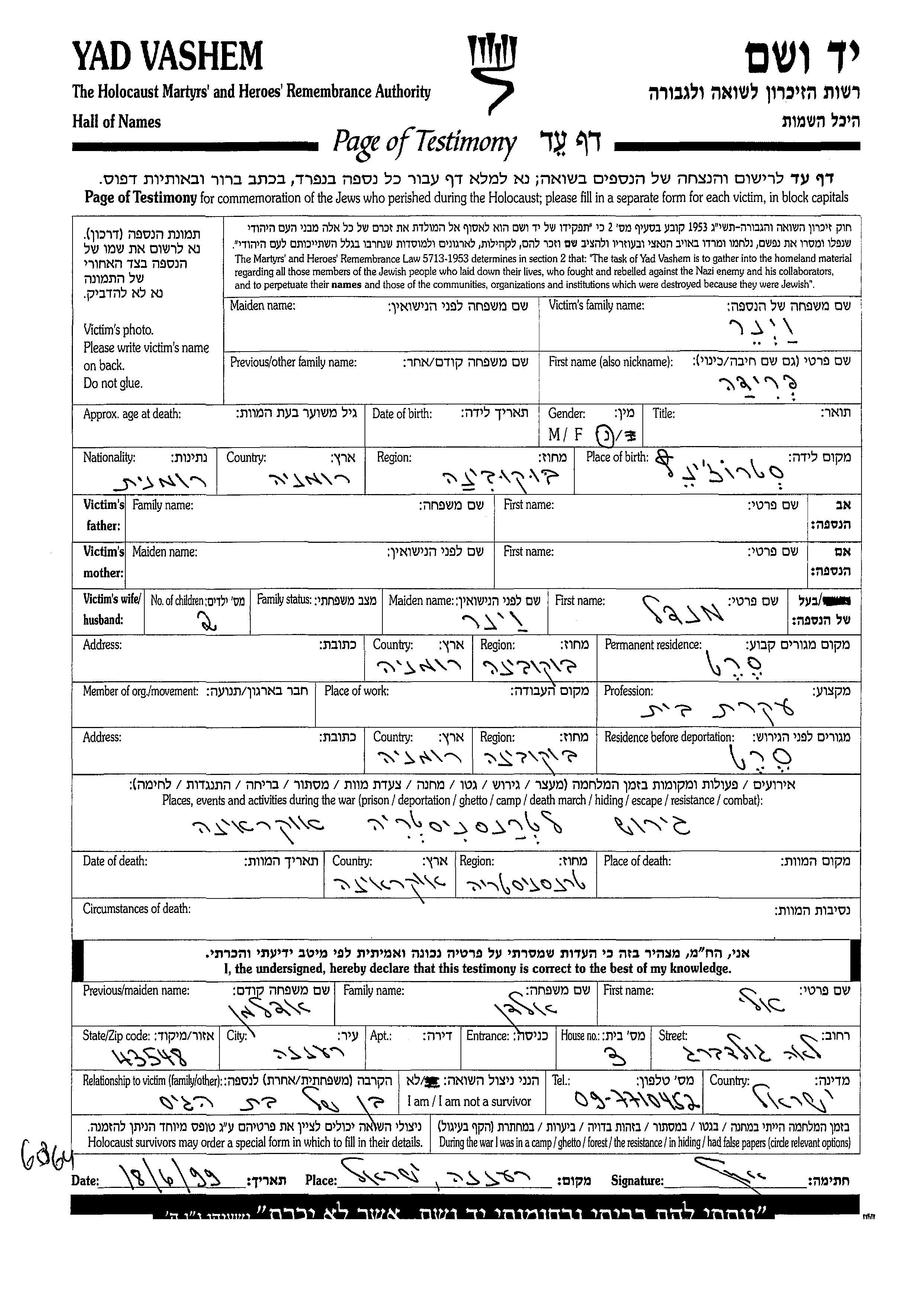 Frida Viner wurde in Strozinetz, Rumänien geboren. Sie war Hausfrau. Vor dem Zweiten Weltkrieg lebte sie in Seret, Rumänien. Während des Krieges war sie in Seret, Rumänien.
