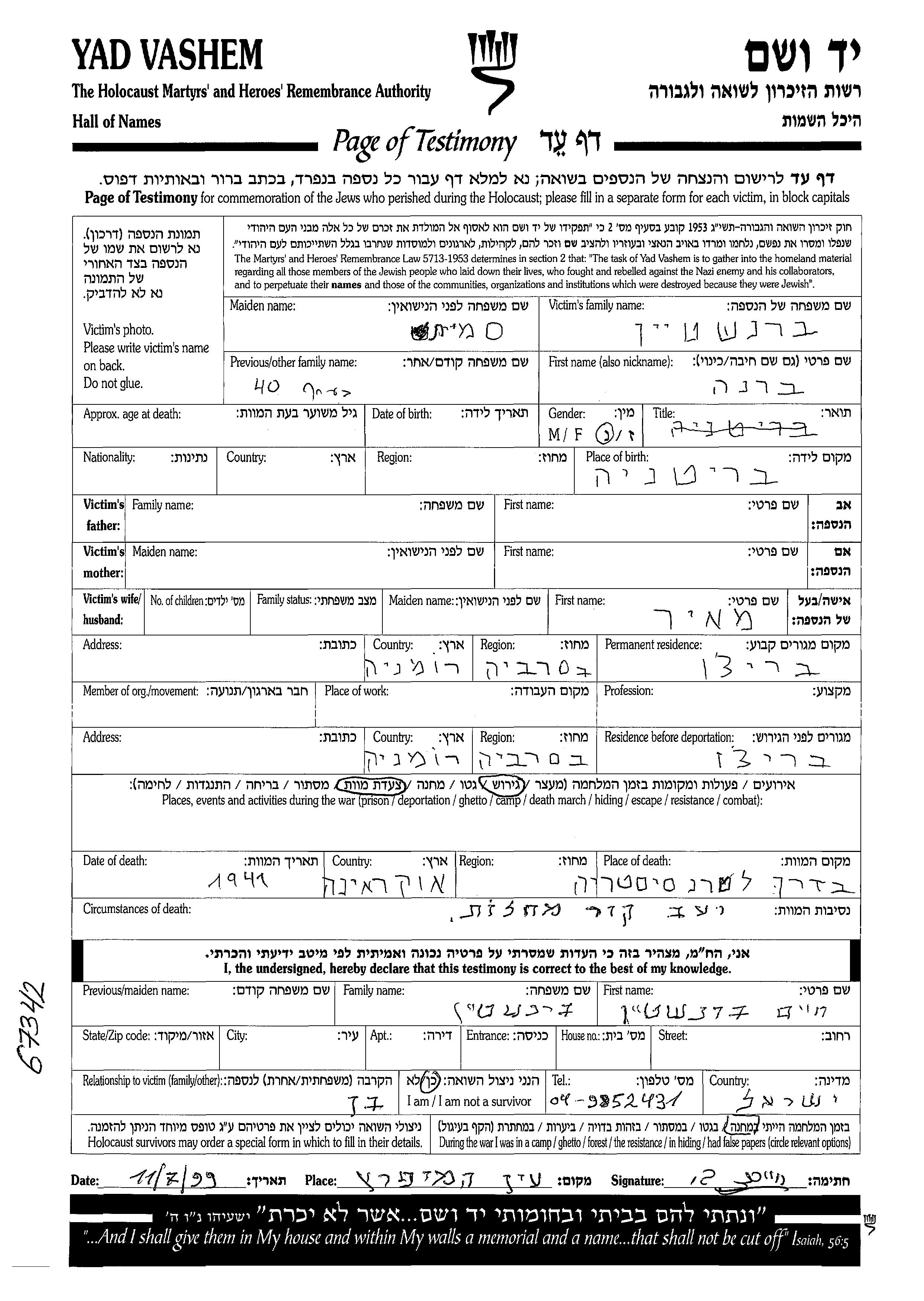 Brana Branshtein, geb. Smith wurde in Großbritannien geboren. Sie war mit Meir Verheiratet. Vor dem Zweiten Weltkrieg lebte sie in Brichevo, Rumänien. Während des Krieges war sie in Brichevo, Rumänien.