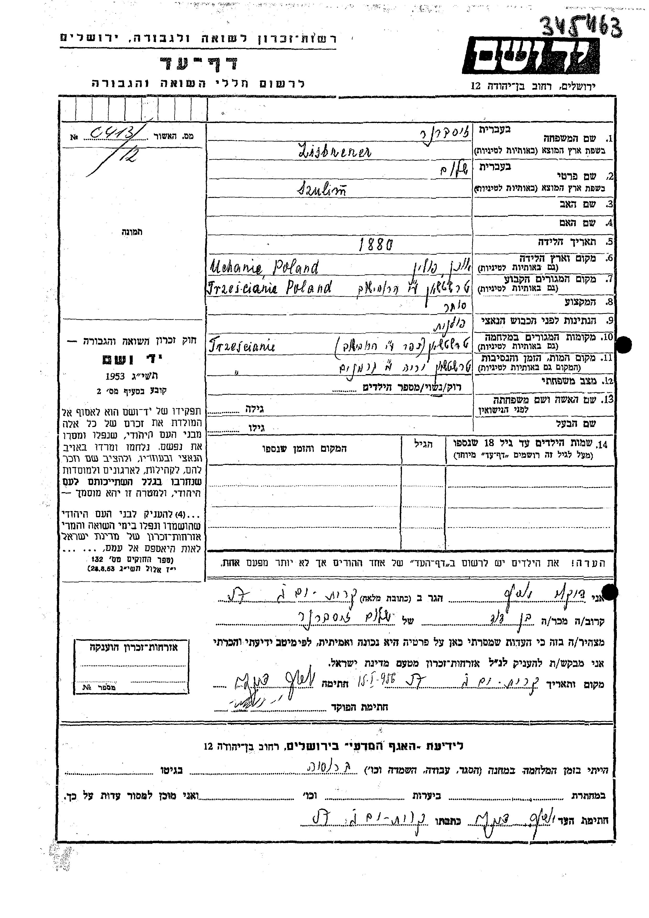 Szulim wurde in der Schoah ermordet. Todesort: Trzcianne, Polen.