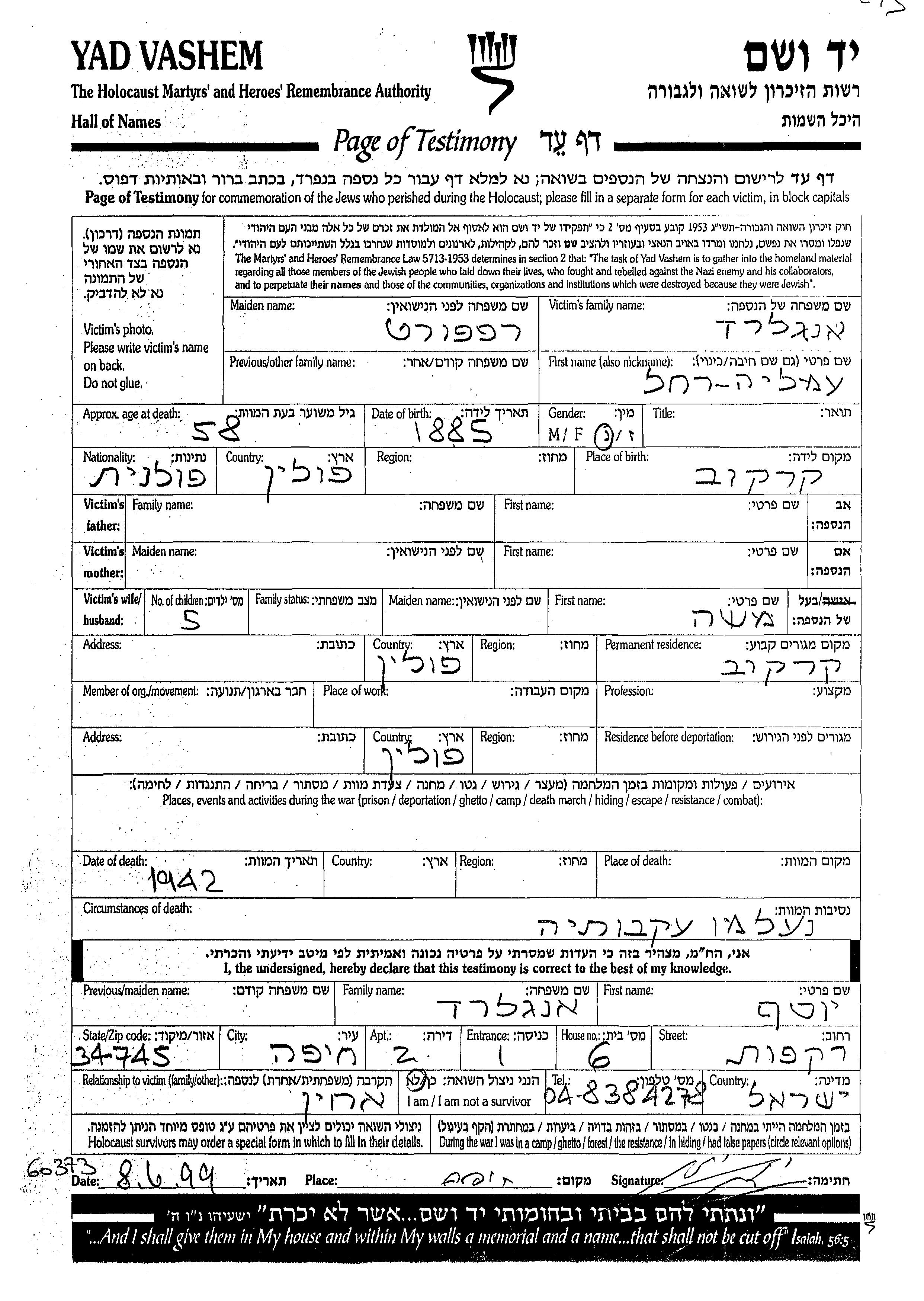 Amalia Rakhel Englard, geb. Rapaport wurde im Jahr 1885 in Krakow, Polen geboren. Vor dem Zweiten Weltkrieg lebte sie in Krakow, Polen. Während des Krieges war sie in Polen.