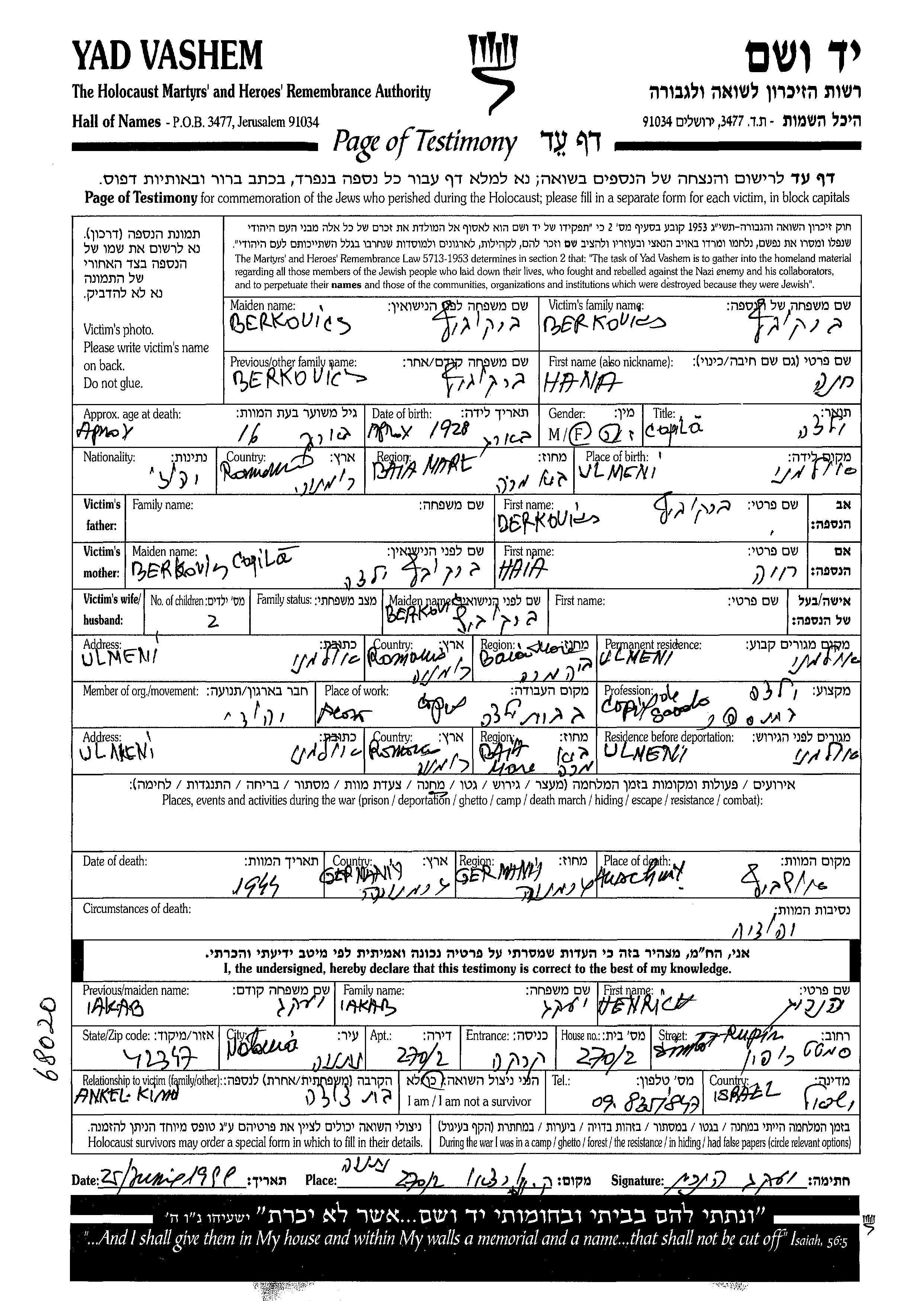 Berkovics Hana 1928 Ulmeni, Rumänien Gedenkblatt