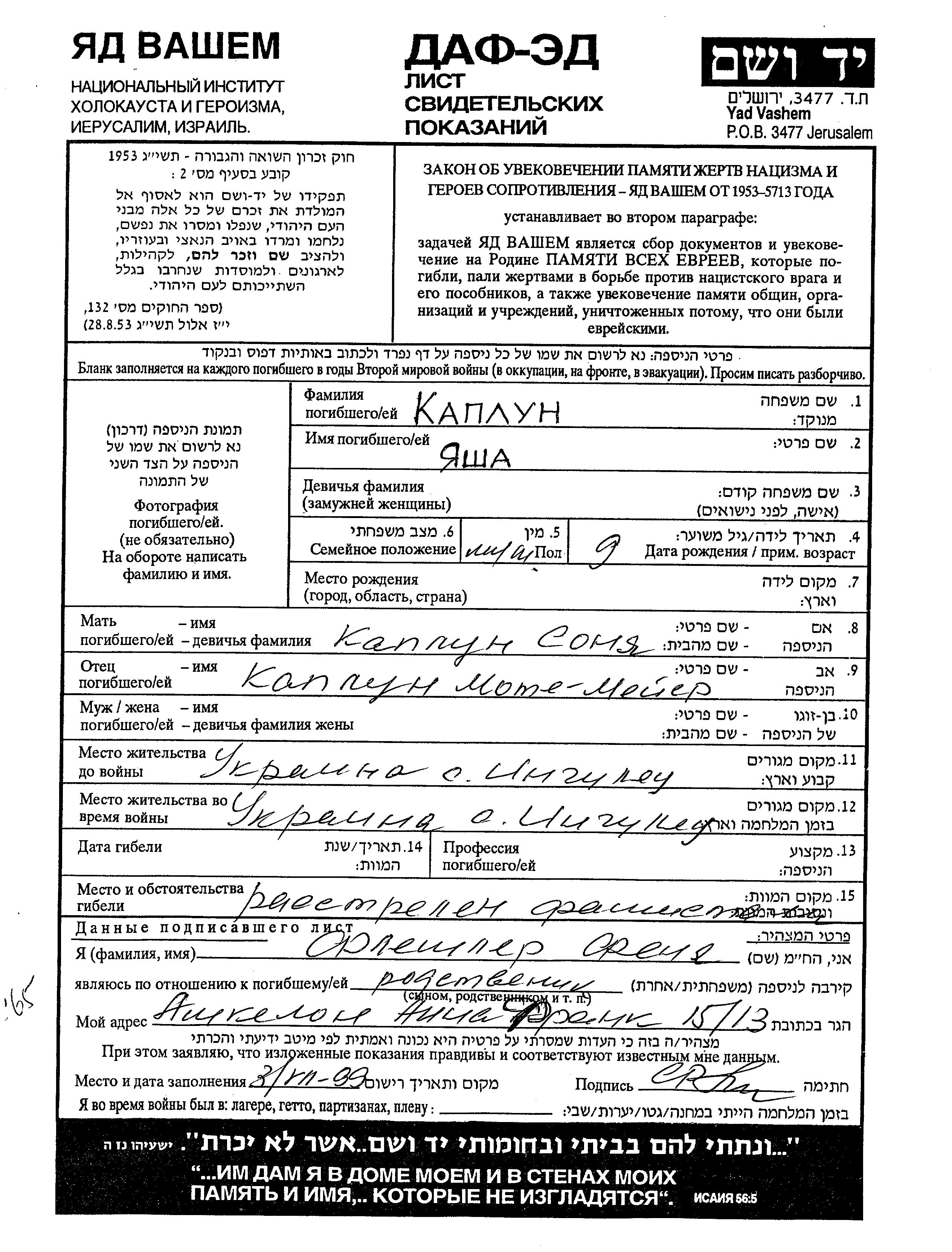 Yasha Kaplun wurde Er war der Sohn von Mote Meir und Sonya. Vor dem Zweiten Weltkrieg lebte er in Ingulec, Ukraine (UdSSR). Während des Krieges war er in Ingulec, Ukraine (UdSSR).