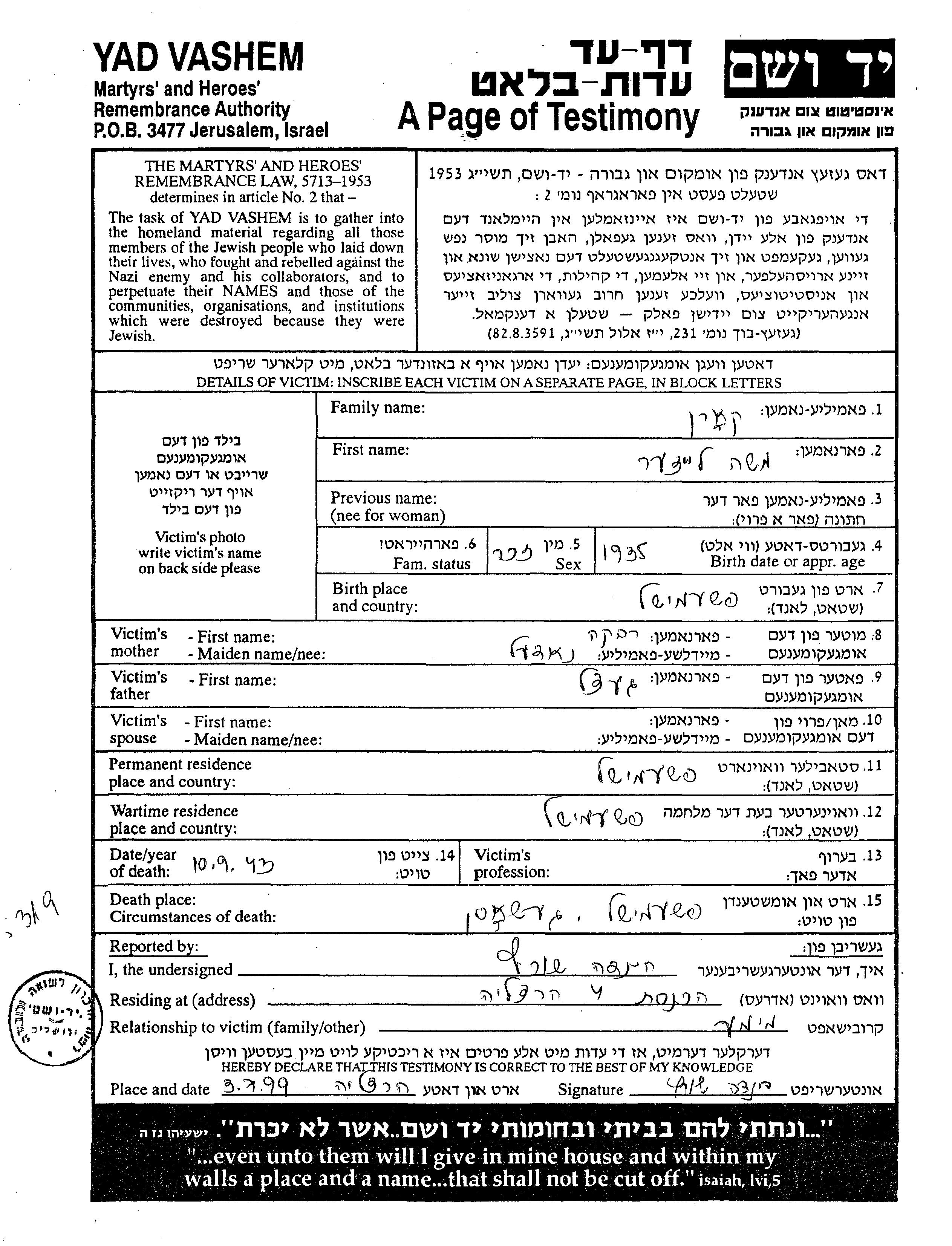 Moshe Leizer wurde in der Schoah ermordet. Todesort: Przemysl, Polen im Jahr 1943.