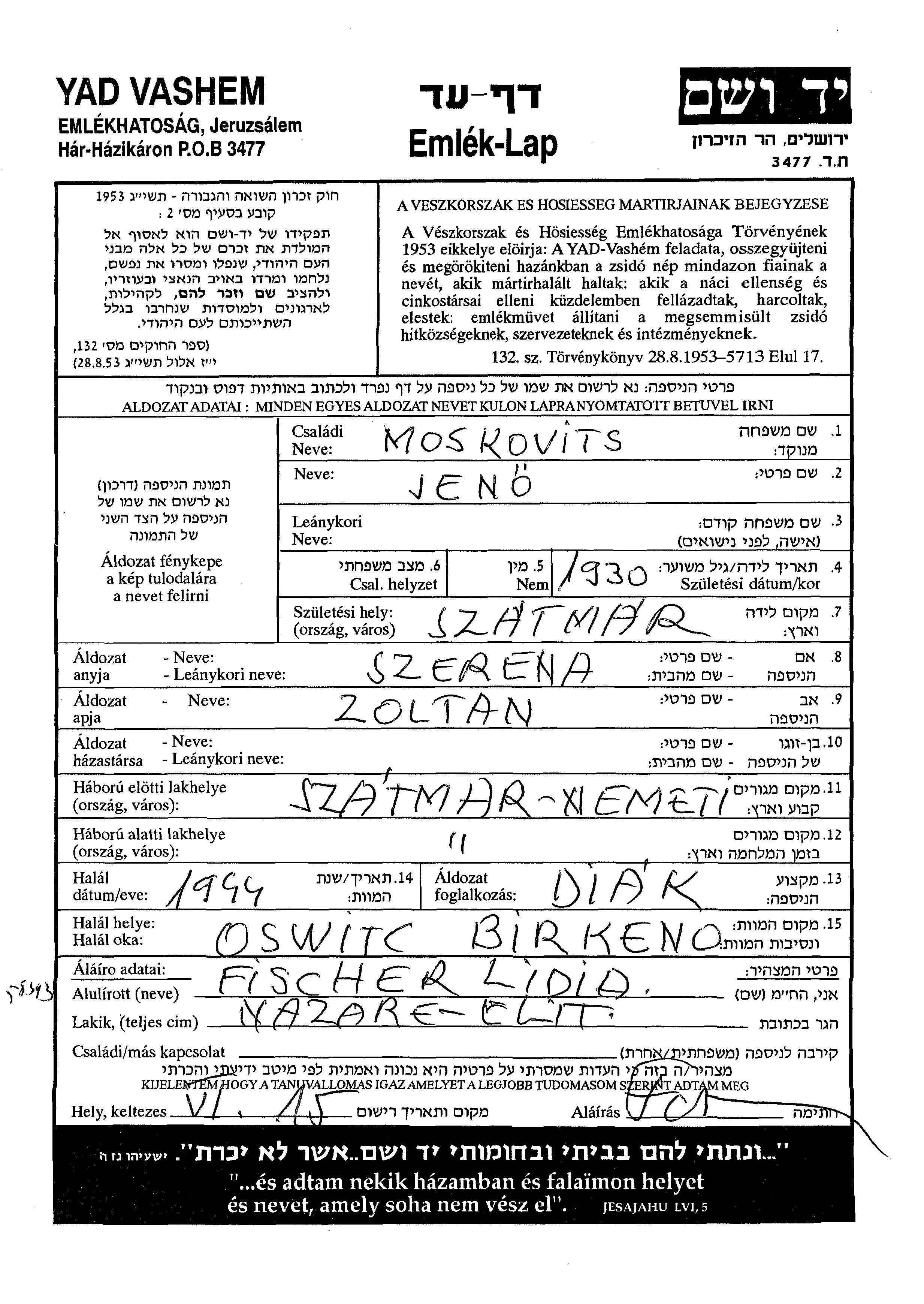 Jeno Moskovits wurde im Jahr 1930 in Szatmarnemeti, Rumänien geboren. Er war der Sohn von Zoltan und Szerena. Er war Schüler/-in. Vor dem Zweiten Weltkrieg lebte er in Szatmarnemeti, Rumänien. Während des Krieges war er in Szatmarnemeti, Rumänien.