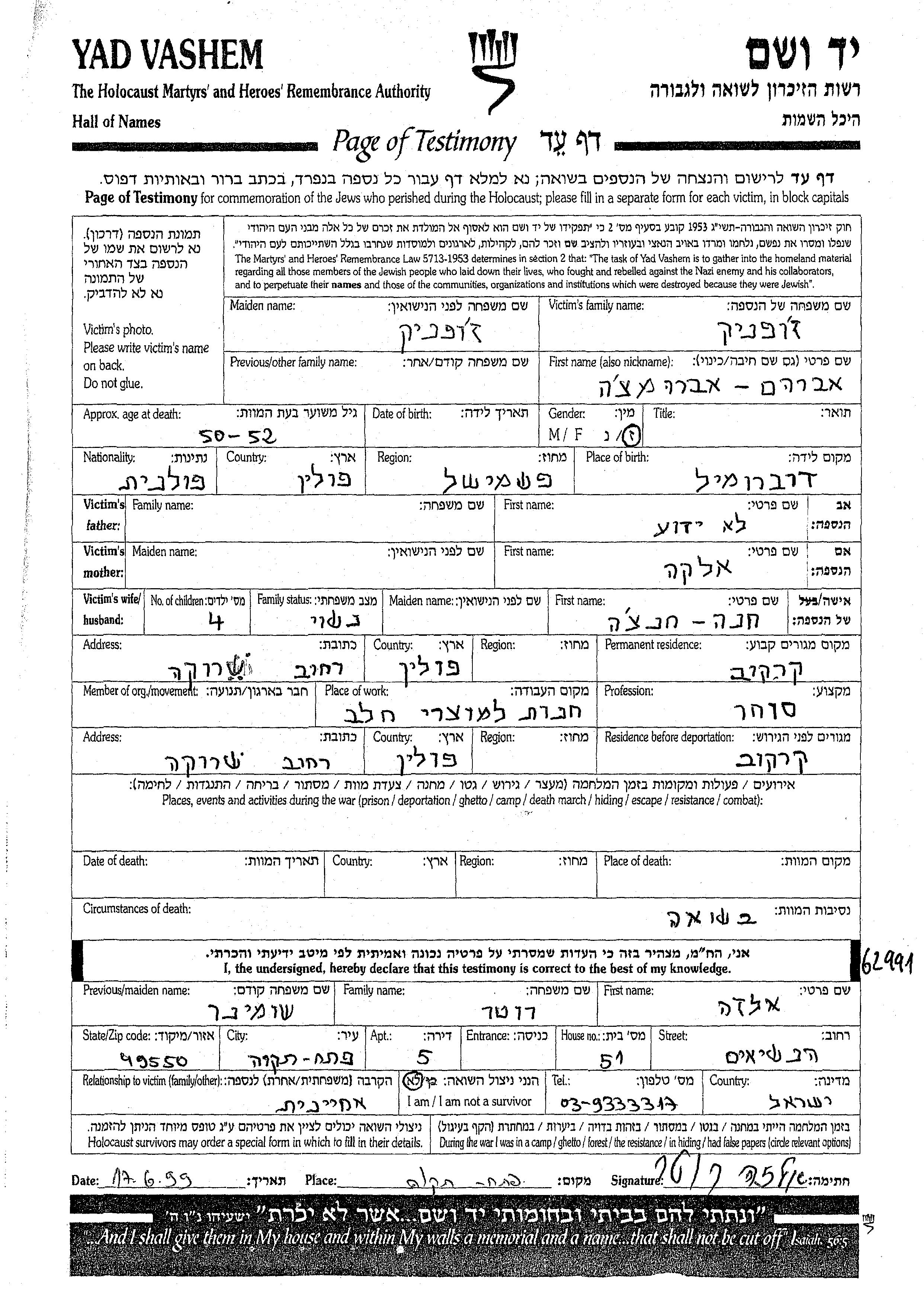 Avraham Zupnik wurde in Dobromil, Polen geboren. Er war der Sohn von Elka. Er war Kaufmann/-frau und mit Khana Verheiratet. Vor dem Zweiten Weltkrieg lebte er in Krakow, Polen. Während des Krieges war er in Krakow, Polen.