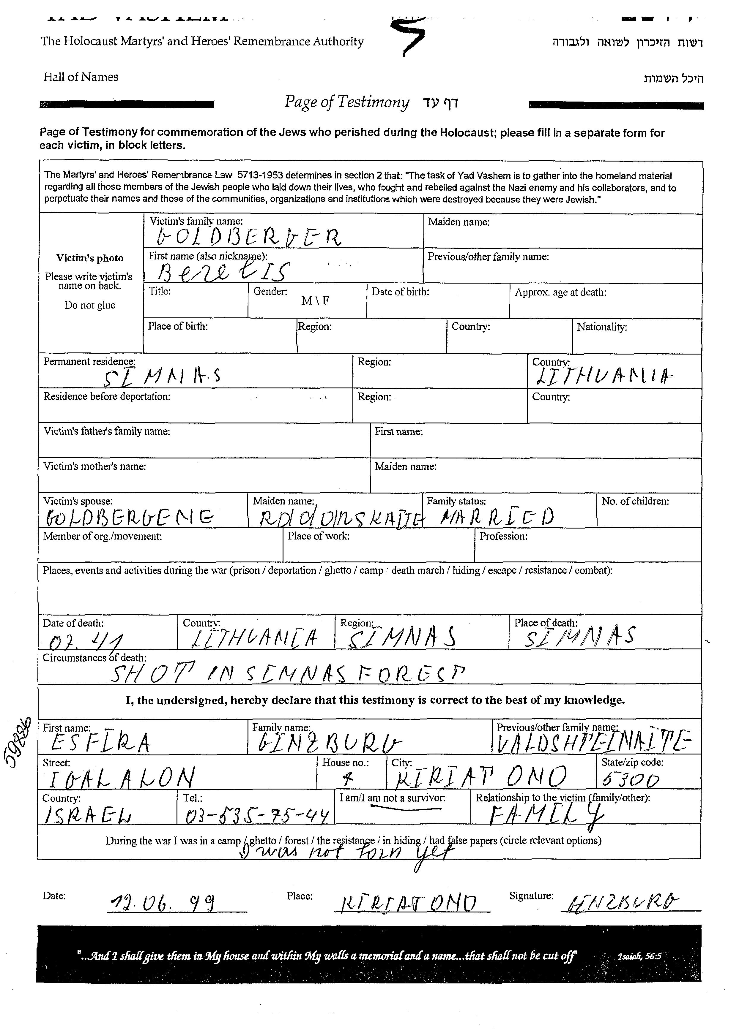 Berelis Goldberger. Er war mit Ite, geb. Radomska Verheiratet. Vor dem Zweiten Weltkrieg lebte er in Simnas, Litauen.