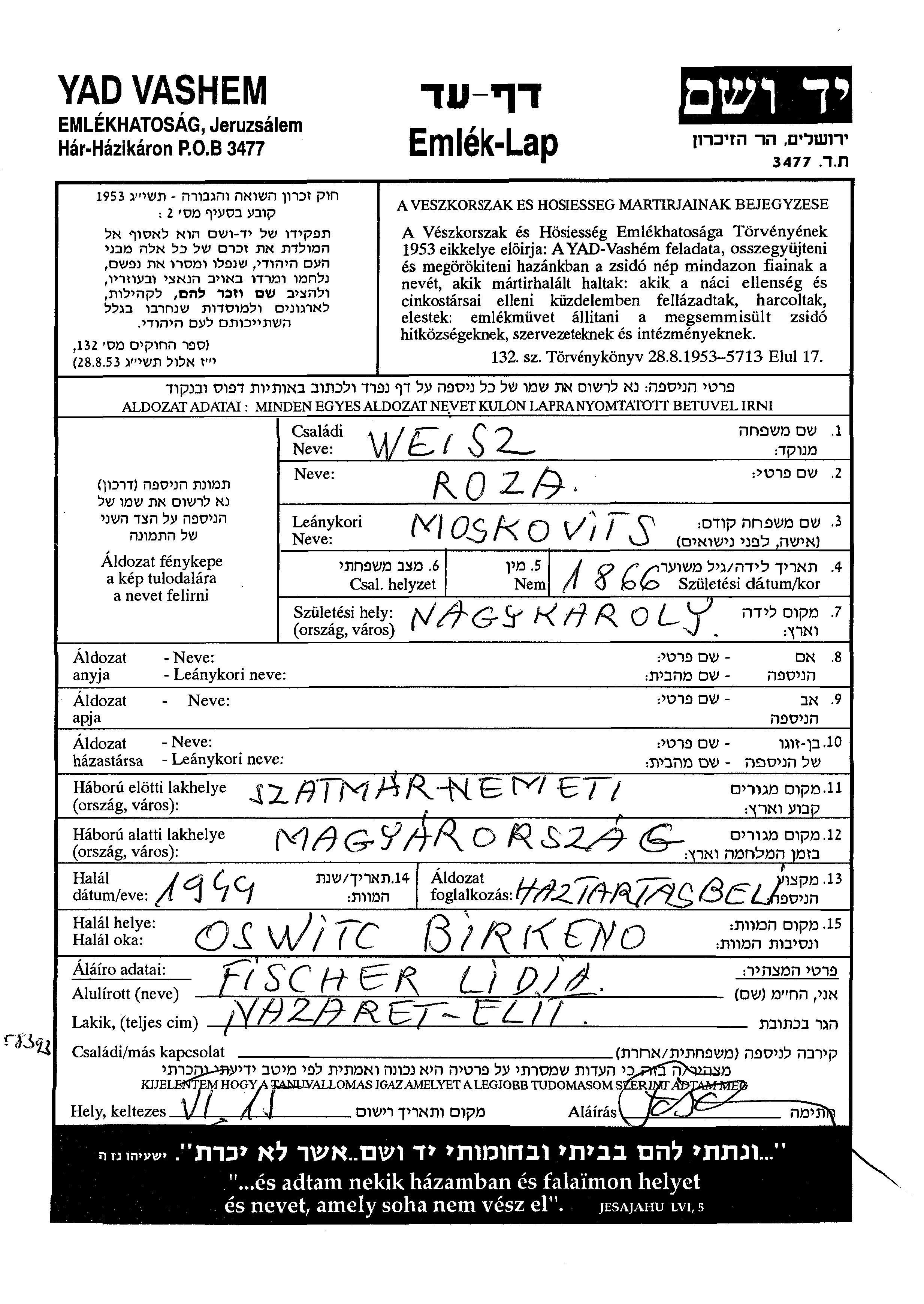 Roza Weisz, geb. Moskovits wurde im Jahr 1866 in Nagykaroly, Rumänien geboren. Sie war Hausfrau und Verheiratet. Vor dem Zweiten Weltkrieg lebte sie in Szatmarnemety, Rumänien. Während des Krieges war sie in Ungarn.