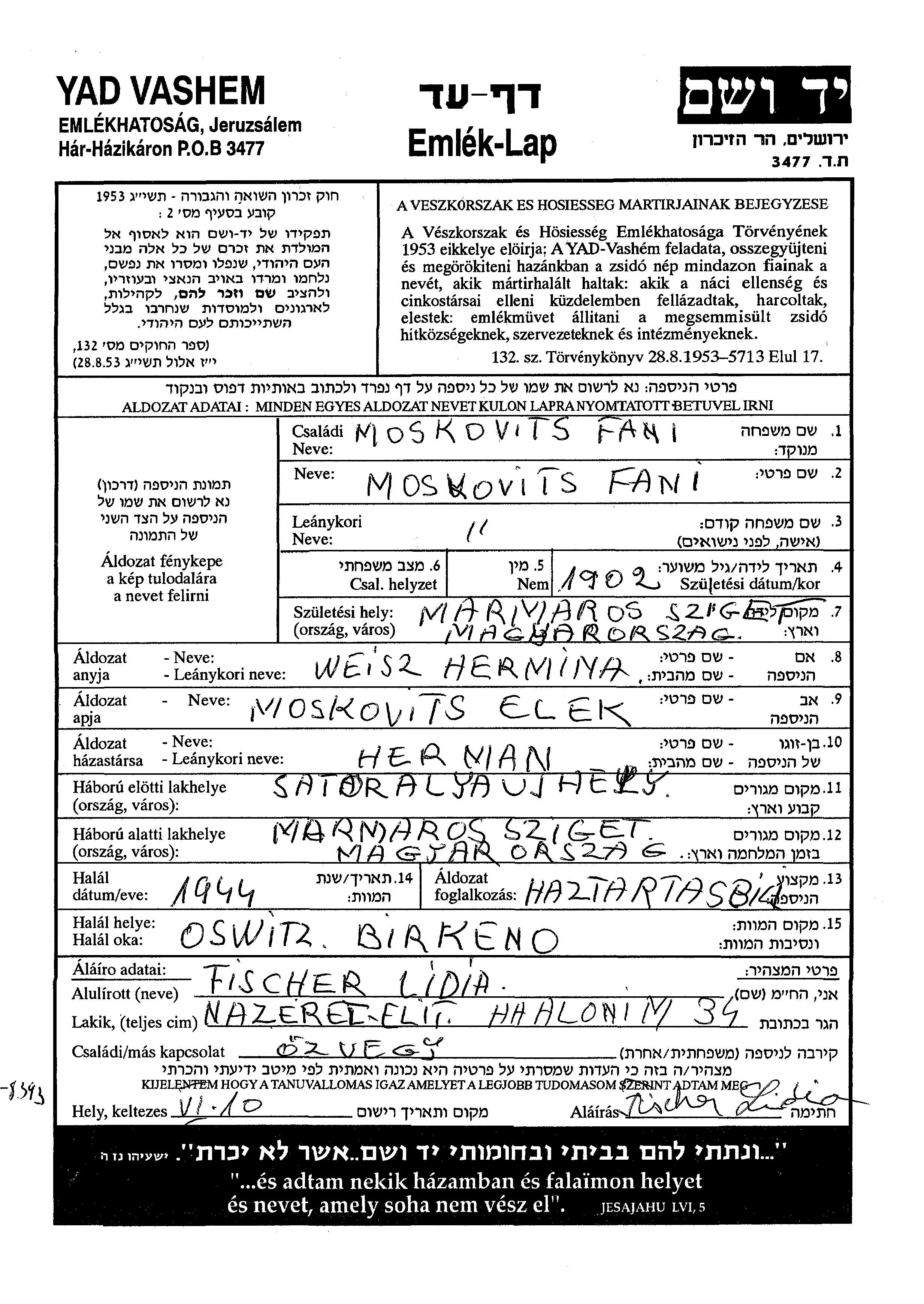 Fani Moskovits wurde im Jahr 1902 in Marmaros Sighet, Rumänien geboren. Sie war die Tochter von Alek und Hermina. Sie war Hausfrau. Vor dem Zweiten Weltkrieg lebte sie in Satoralya Ujhely, Ungarn. Während des Krieges war sie in Marmaros Sighet, Rumänien.