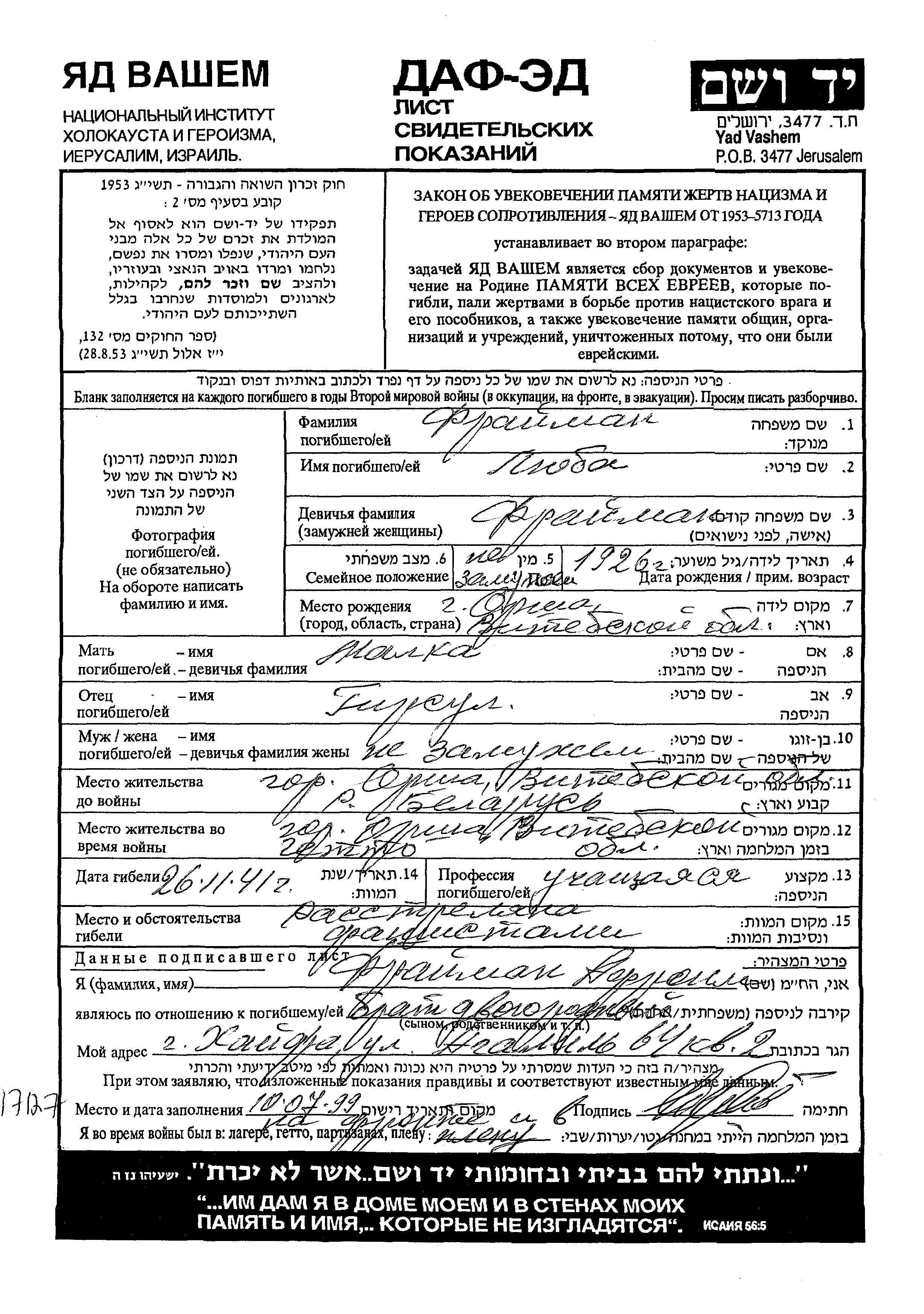 Fraiman Lyuba 1926 Orsha, Weißrussland (UdSSR) Gedenkblatt