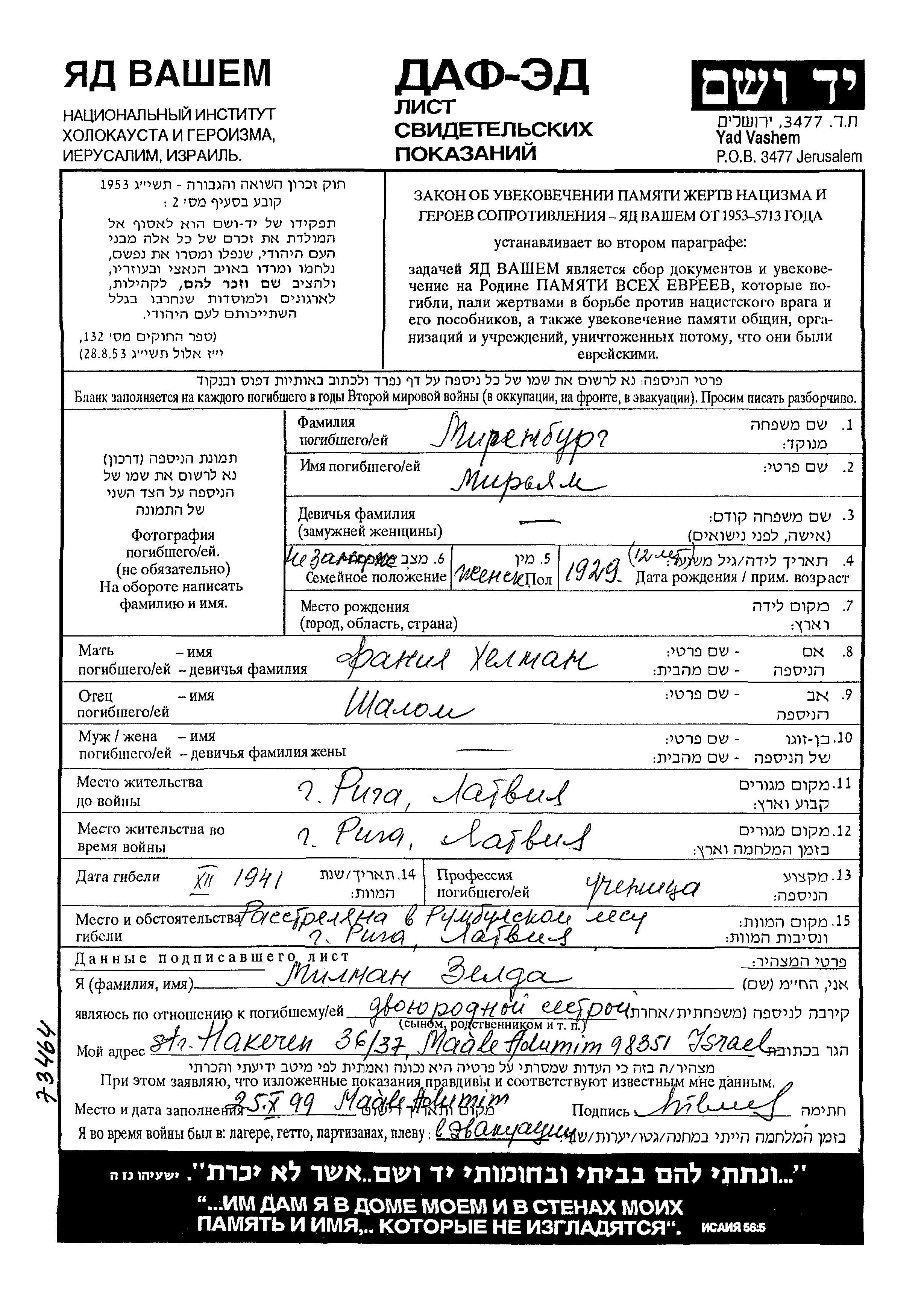 Miriam Mirenburg wurde im Jahr 1929 geboren. Sie war die Tochter von Shalom und Faniya, geb. Helman. Sie war Schüler/-in und Kind. Vor dem Zweiten Weltkrieg lebte sie in Riga, Lettland. Während des Krieges war sie in Riga, Lettland.