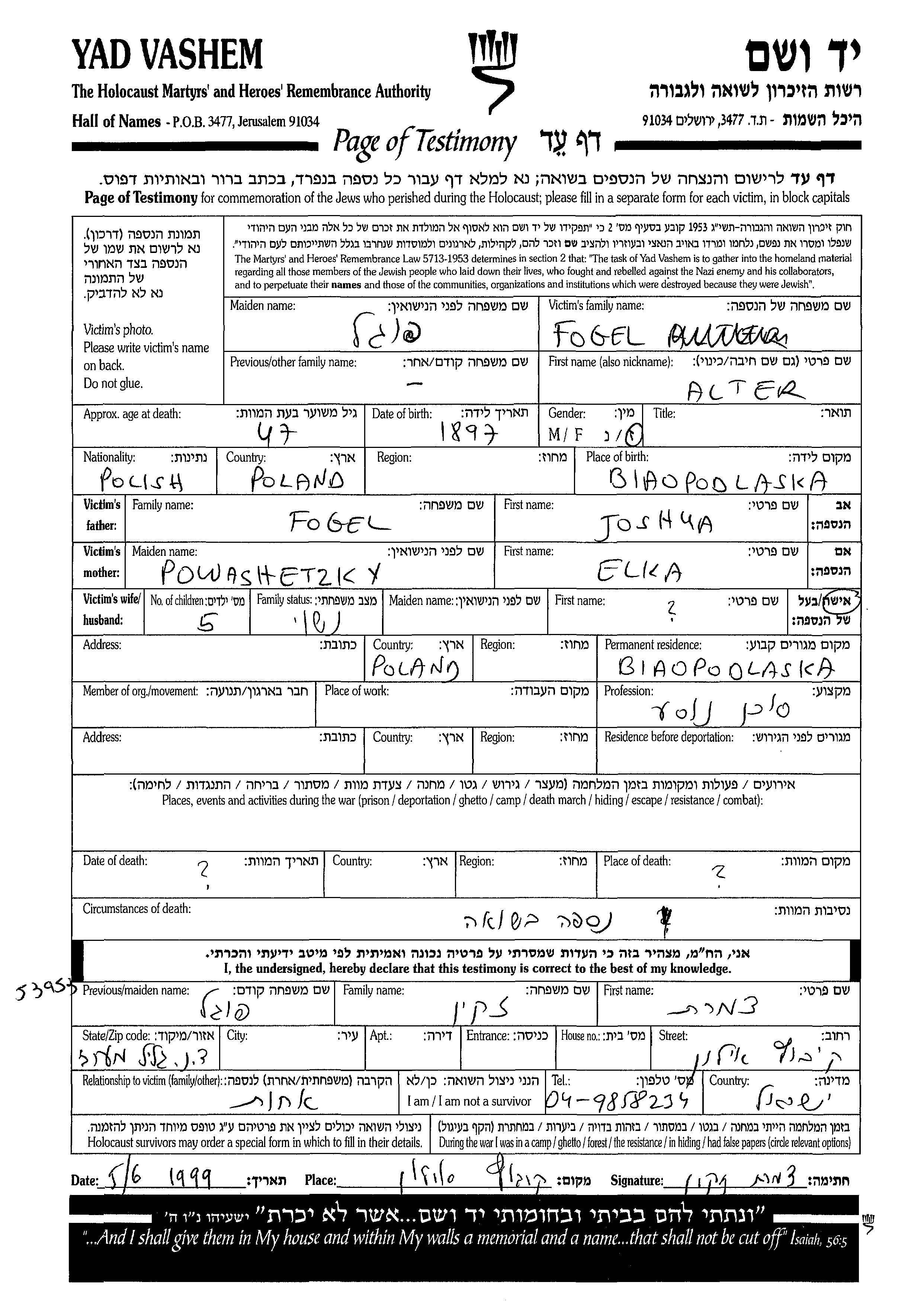 Alter Fogel wurde im Jahr 1897 in Biala Podlaska, Polen geboren. Er war der Sohn von Joshua und Elka. Er war Reisender und Verheiratet. Vor dem Zweiten Weltkrieg lebte er in Biala Podlaska, Polen.