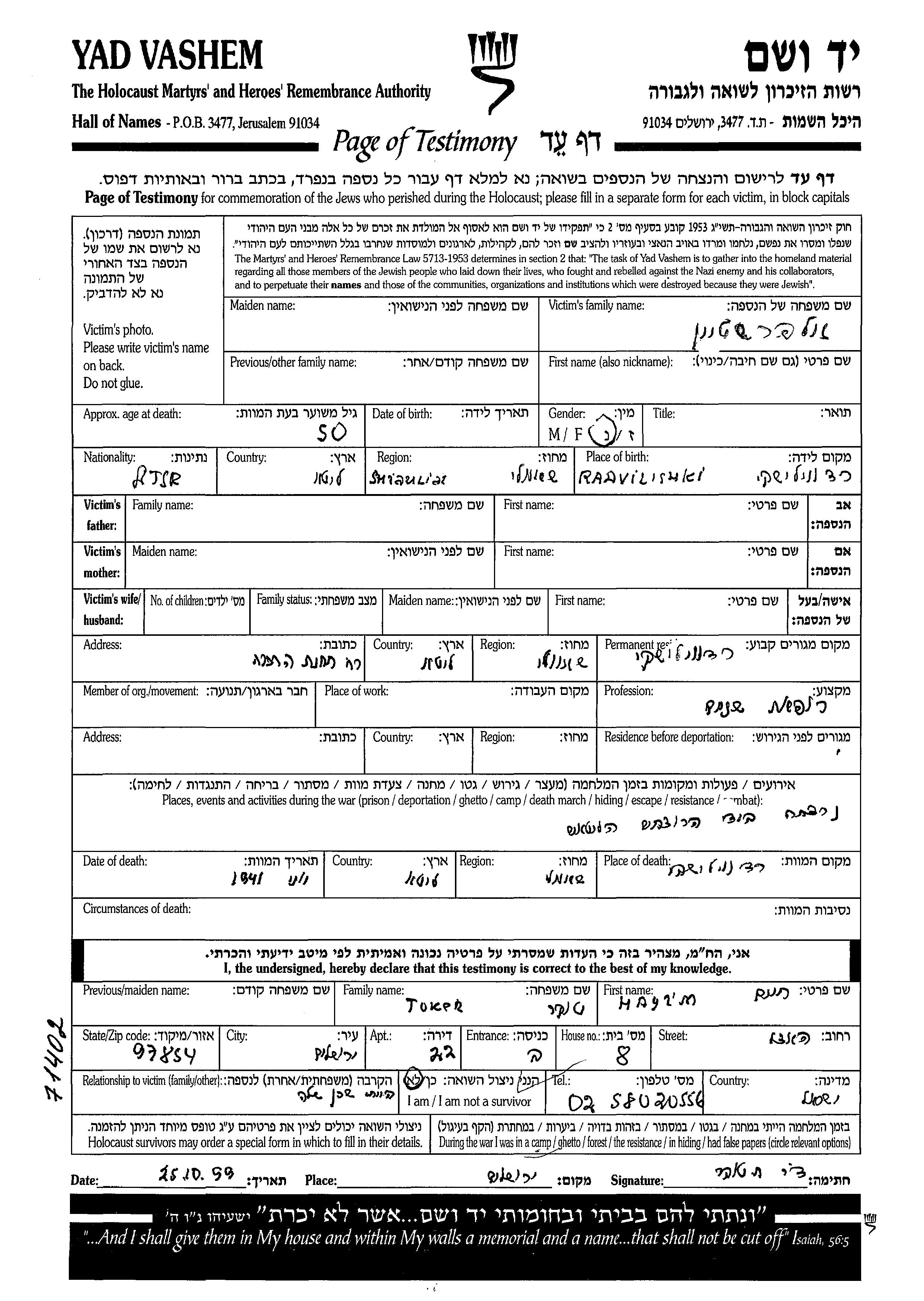 Vorname unbekannt Alpershtein wurde in Radviliskis, Litauen geboren. Sie war Zahnarzt/-ärztin. Vor dem Zweiten Weltkrieg lebte sie in Radviliskis, Litauen.