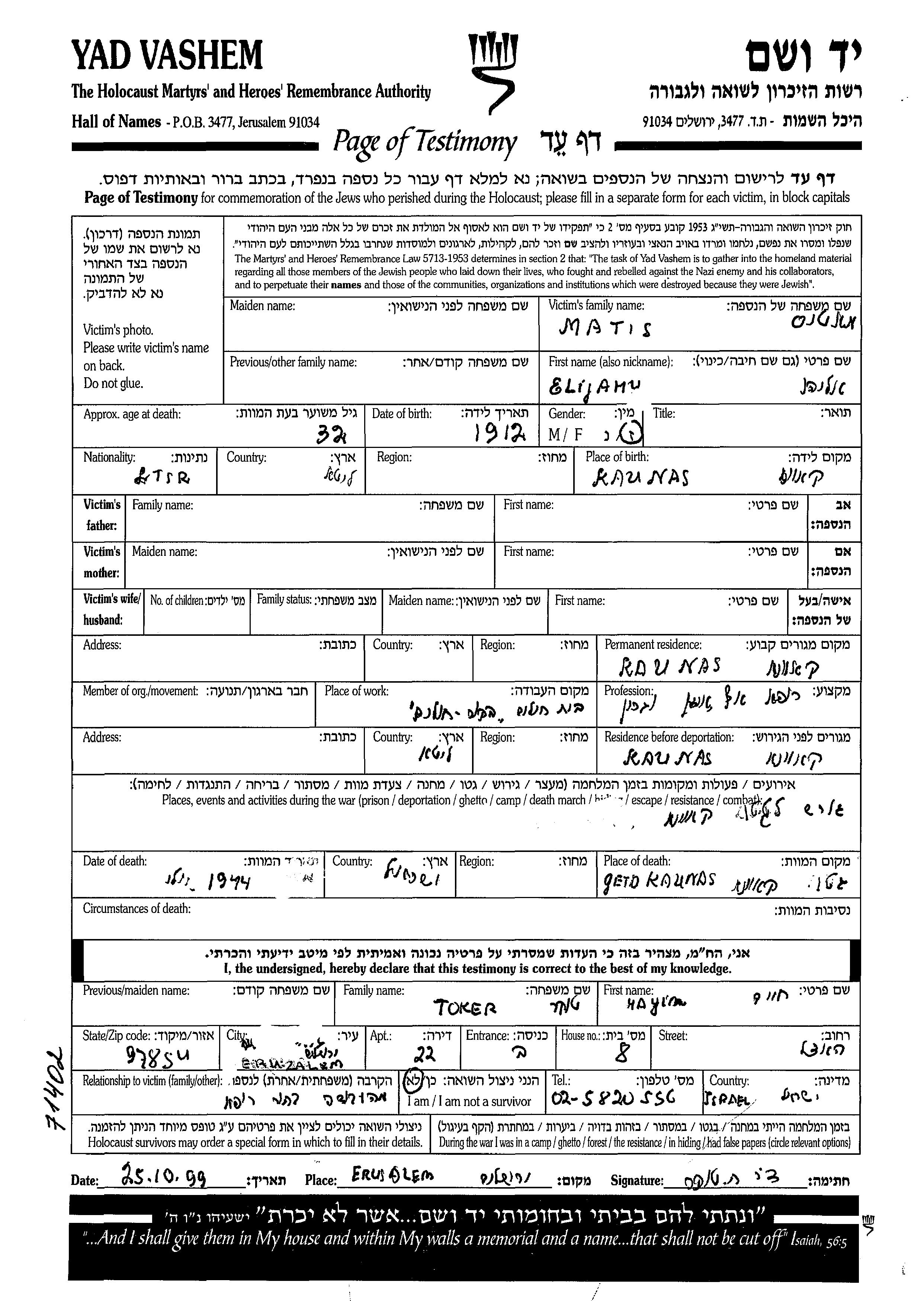 Mates Matis Eliyahu 1912 Kaunas, Litauen Gedenkblatt