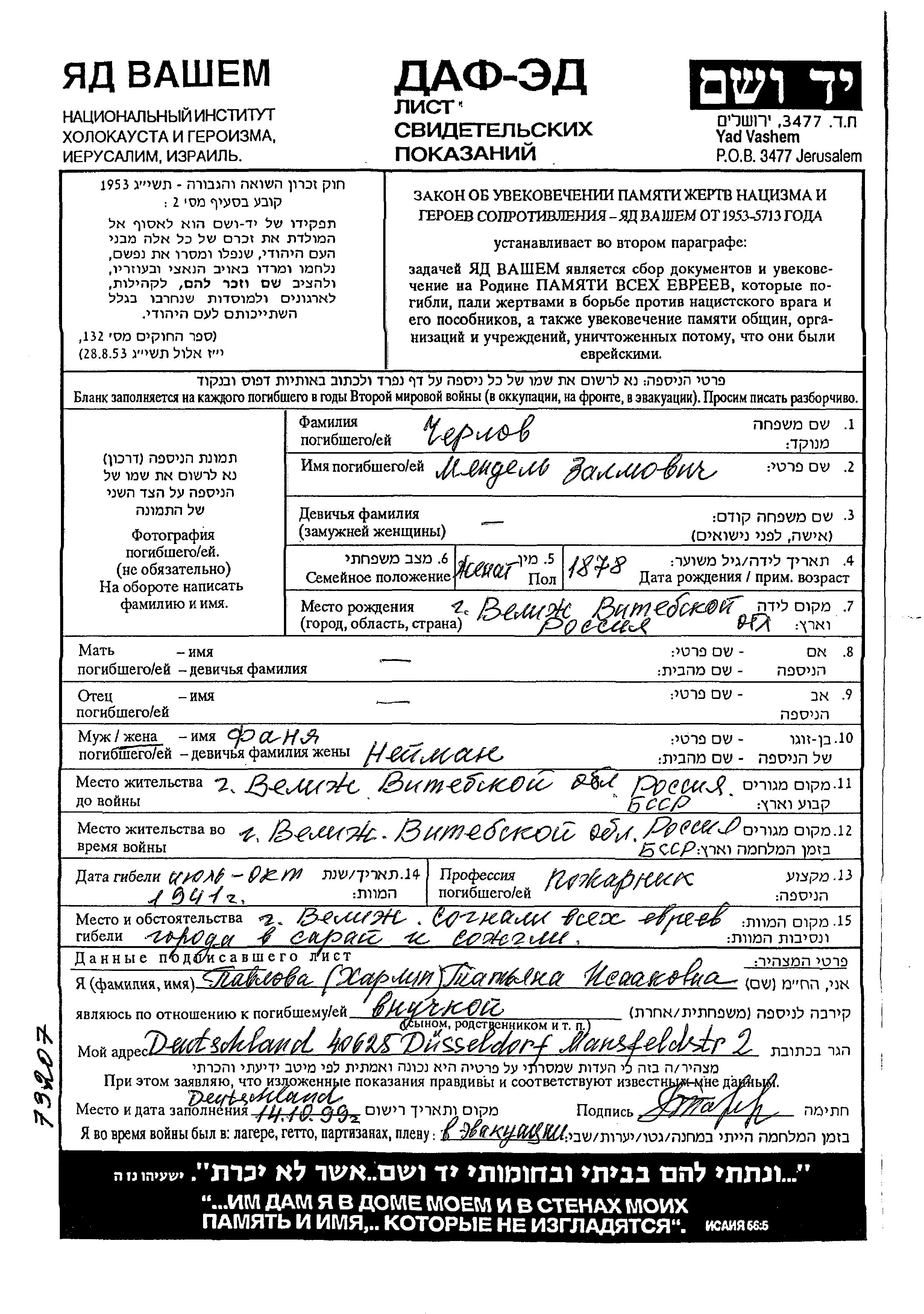 Mendel wurde in der Schoah ermordet. Todesort: Velizh, Russland (UdSSR) im Jahr 1941.
