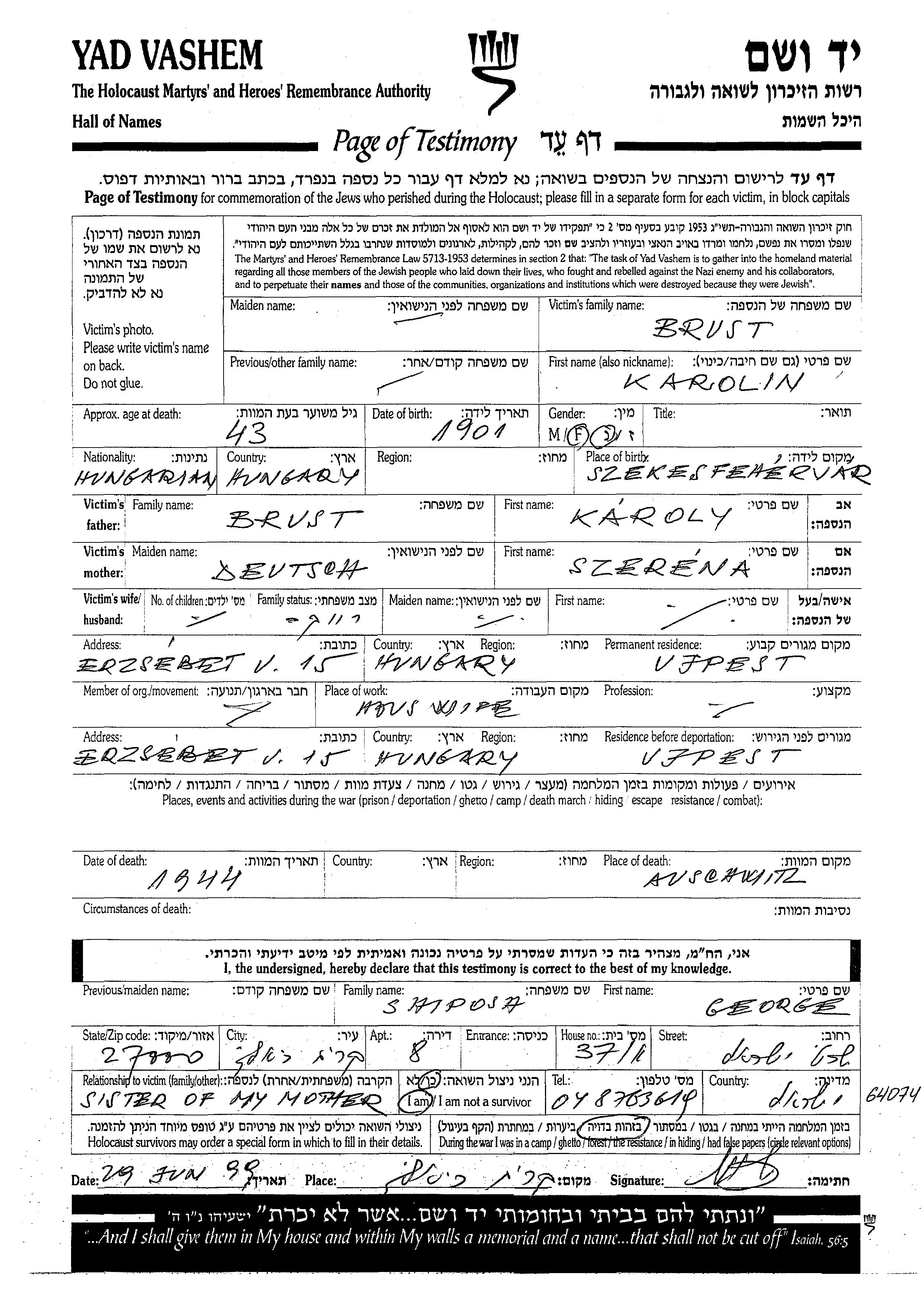 Karolin Brust wurde im Jahr 1901 in Szekesfehervar, Ungarn geboren. Sie war die Tochter von Karoly und Szerena. Sie war Ledig. Vor dem Zweiten Weltkrieg lebte sie in Ujpest, Ungarn. Während des Krieges war sie in Ujpest, Ungarn.