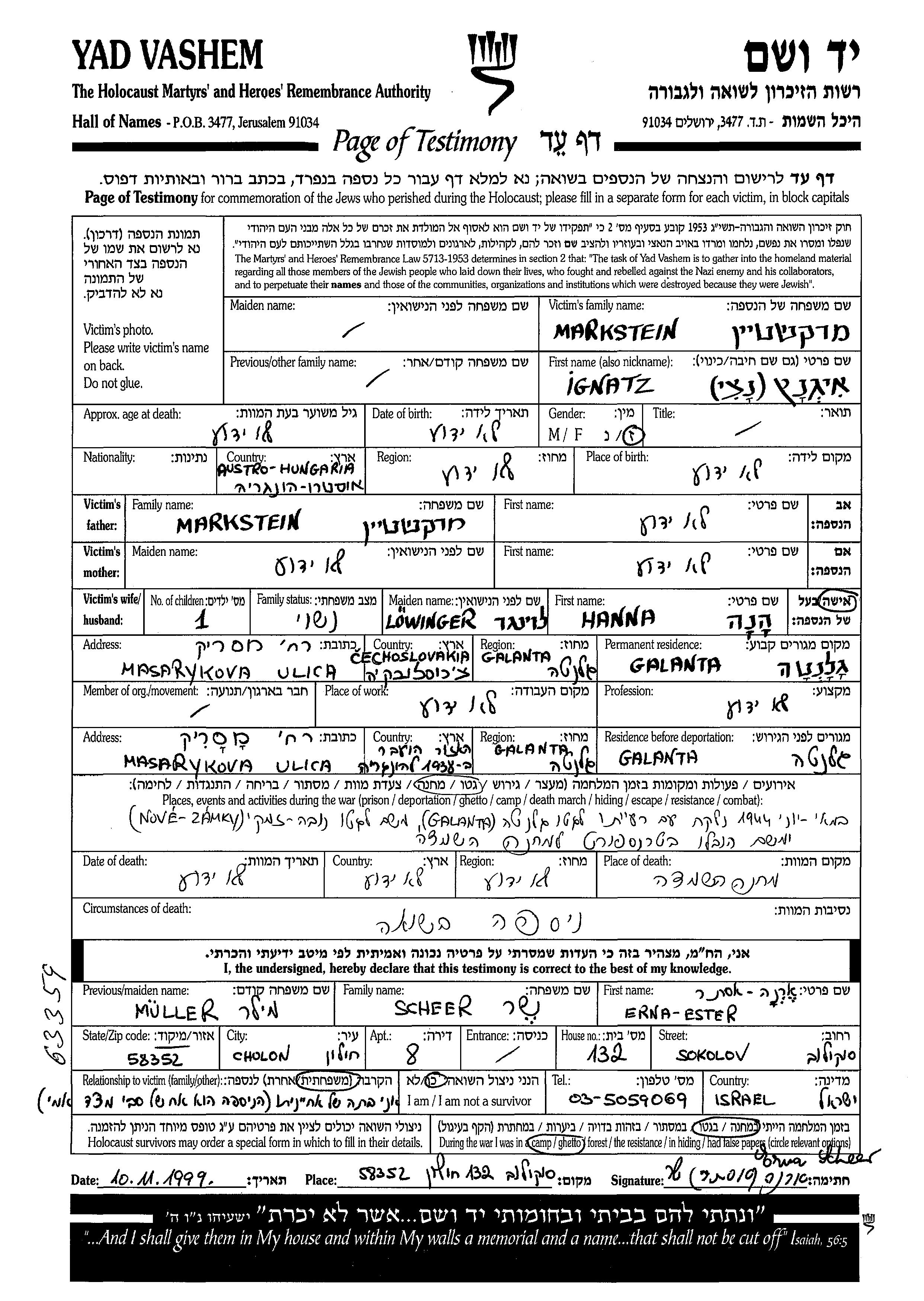 Ignatz Markstein wurde in Österreich-Ungarn geboren. Er war mit Hanna, geb. Löwinger Verheiratet. Vor dem Zweiten Weltkrieg lebte er in Galanta, Tschechoslowakei. Während des Krieges war er in Nove Zamky, Tschechoslowakei.