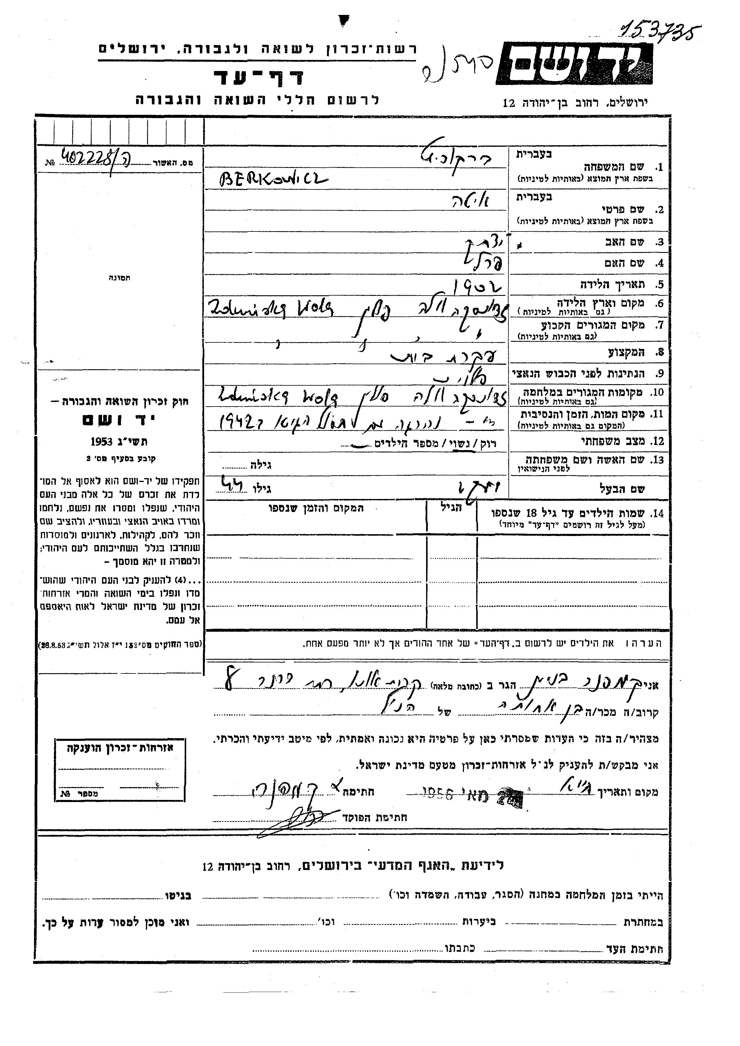 Ita Berkowicz wurde im Jahr 1902 in Zdunska Vola, Polen geboren. Sie war die Tochter von Yitzkhak und Perel. Sie war Hausfrau und mit Yaakov Verheiratet. Vor dem Zweiten Weltkrieg lebte sie in Zdunska Vola, Polen. Während des Krieges war sie in Zdunska Vola, Polen.