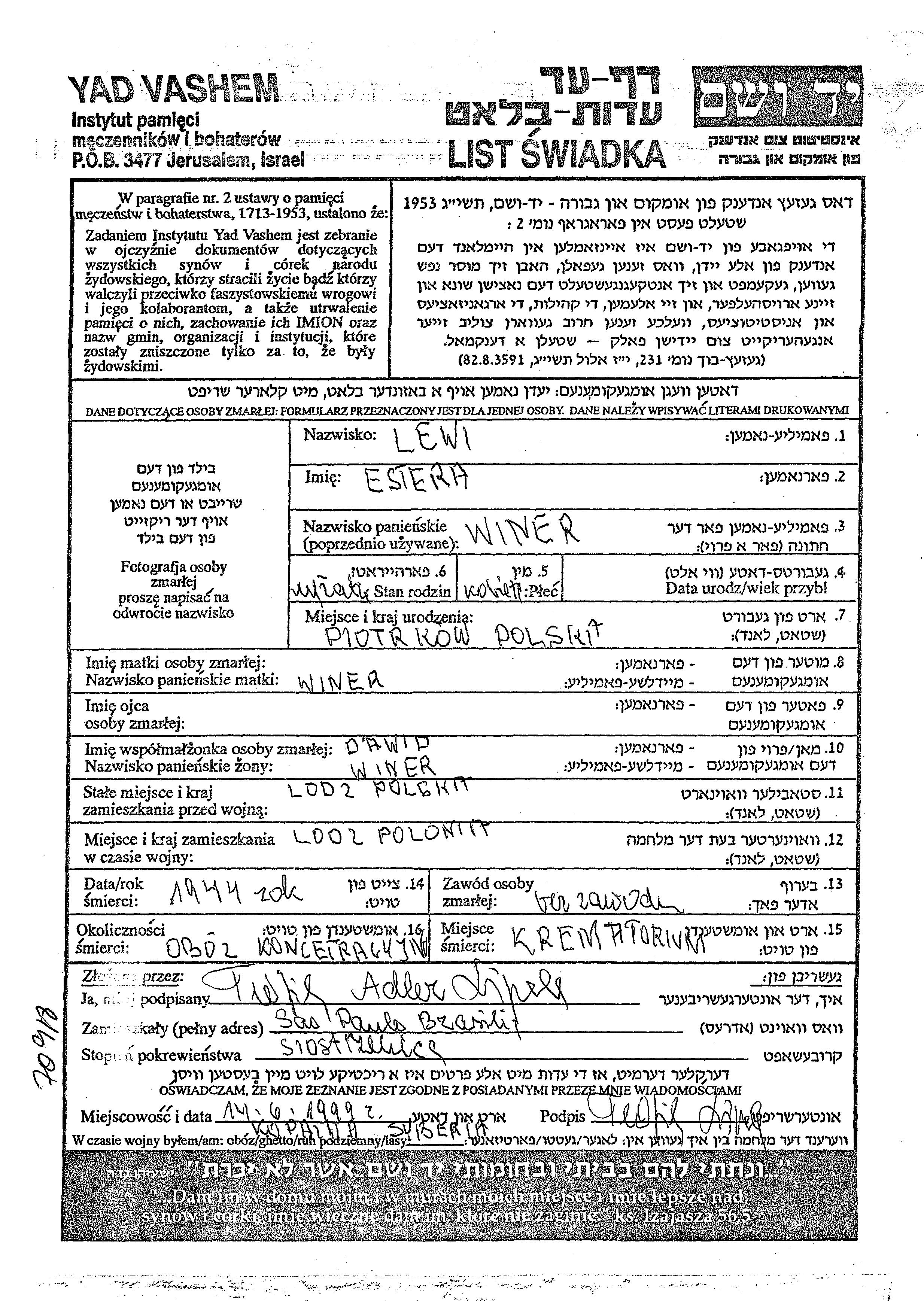 Estera Lewi, geb. Winer wurde in Piotrkow Trybunalski, Polen geboren. Sie war mit Dawid Verheiratet. Vor dem Zweiten Weltkrieg lebte sie in Lodz, Polen. Während des Krieges war sie in Lodz, Polen.