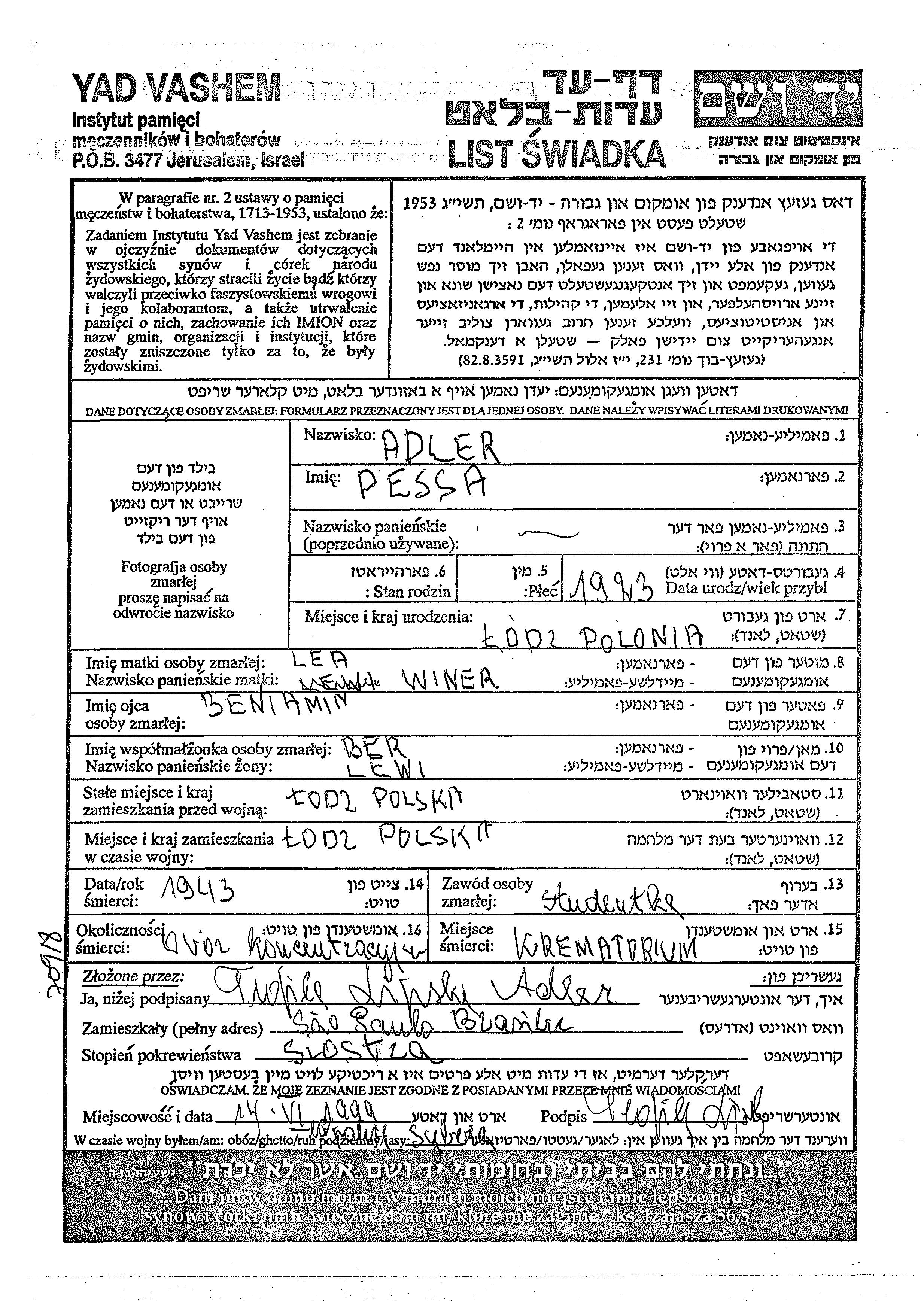 Pessa Lewi, geb. Adler wurde im Jahr 1923 in Lodz, Polen geboren. Sie war die Tochter von Beniamin und Lea. Sie war Student. Vor dem Zweiten Weltkrieg lebte sie in Lodz, Polen. Während des Krieges war sie in Lodz, Polen.