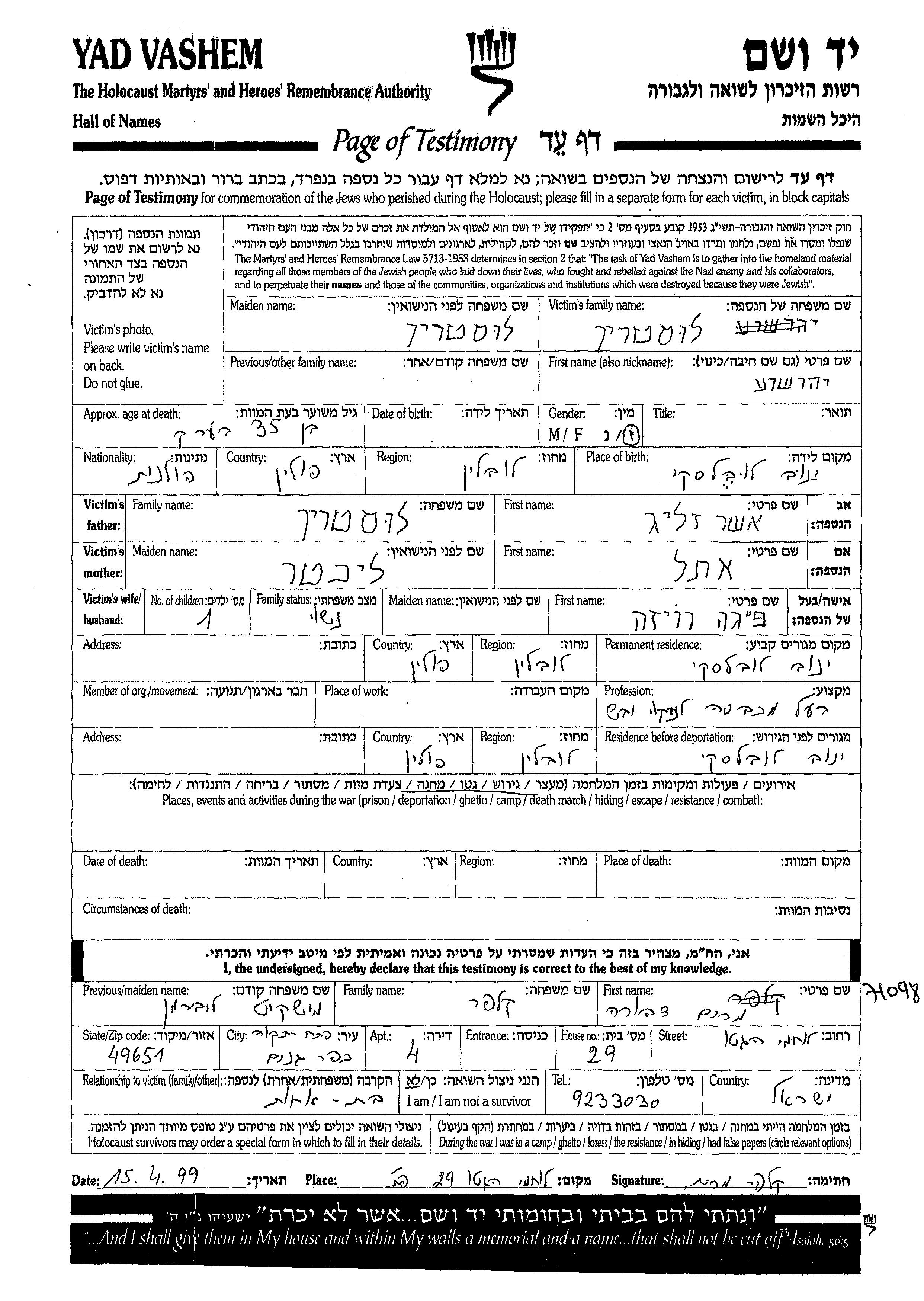 Yehoshua Lustrin wurde in Janow Lubelski, Polen geboren. Er war der Sohn von Asher Zelig und Etel. Er war בעל מכבסה לניקוי יבש. Vor dem Zweiten Weltkrieg lebte er in Janow Lubelski, Polen. Während des Krieges war er in Janow Lubelski, Polen.