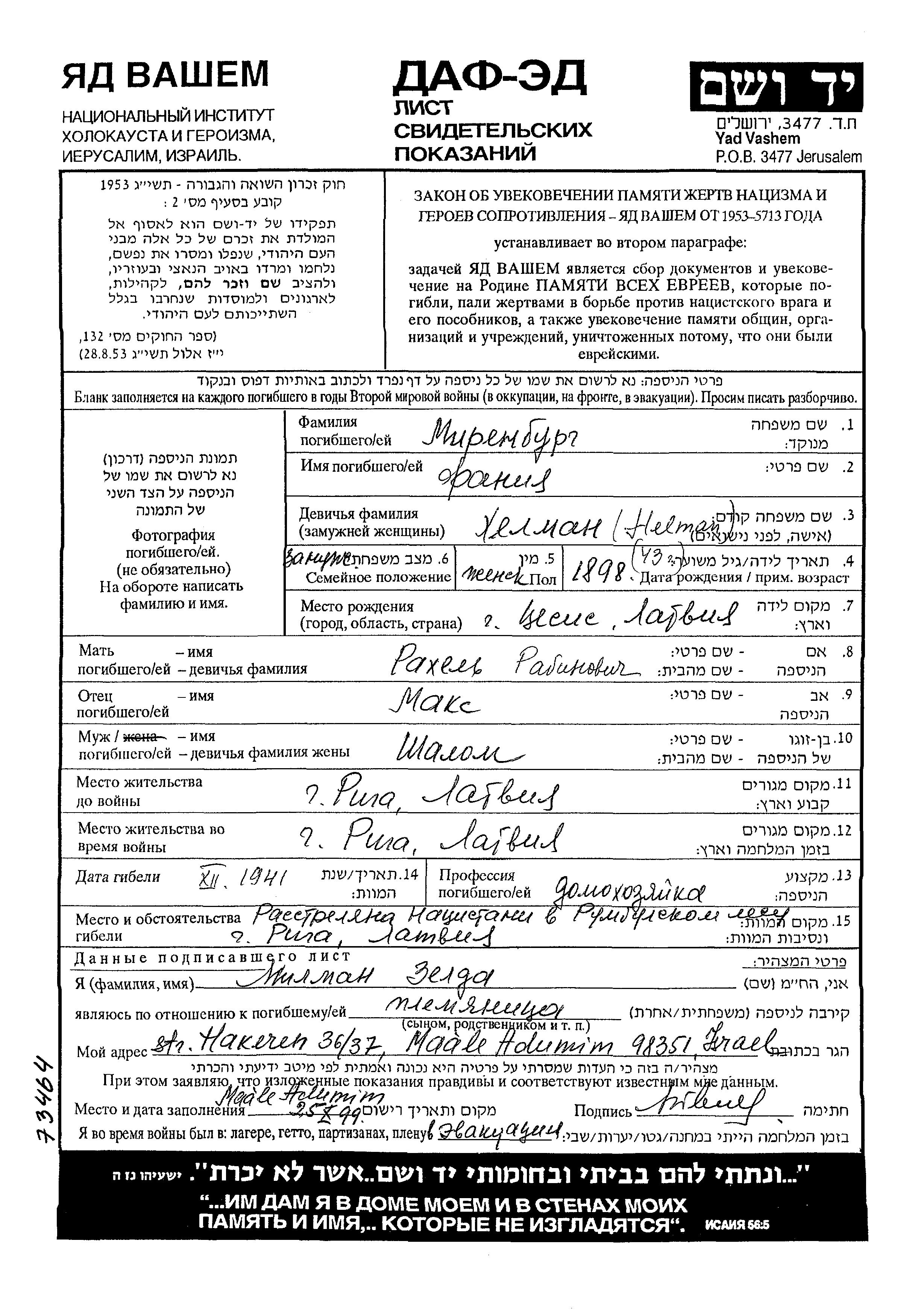 Faniya Mirenburg, geb. Helman wurde im Jahr 1898 in Cesis, Lettland geboren. Sie war die Tochter von Maks und Rakhel. Sie war Hausfrau und mit Shalom Verheiratet. Vor dem Zweiten Weltkrieg lebte sie in Riga, Lettland. Während des Krieges war sie in Riga, Lettland.