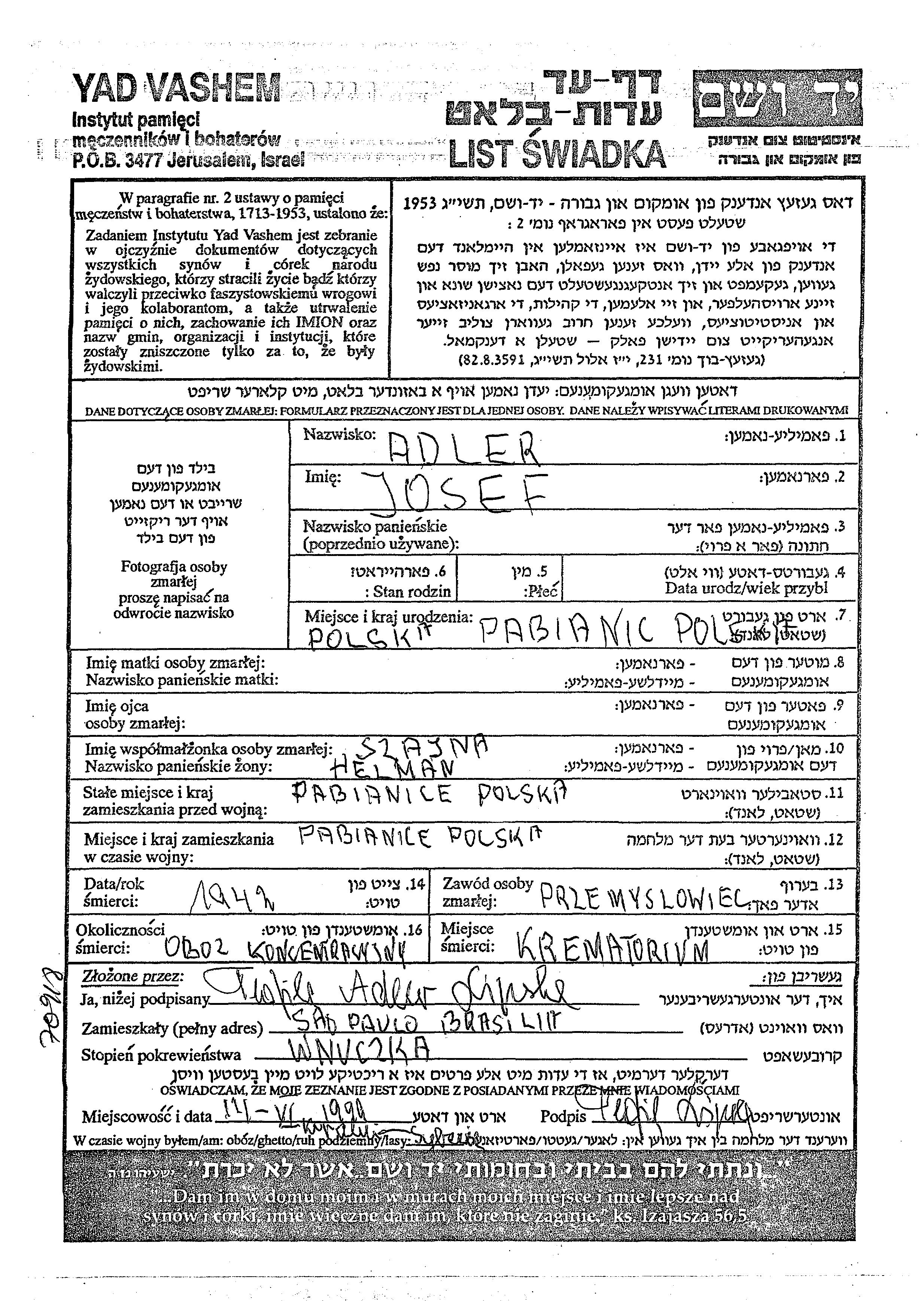 Josef Adler wurde in Pabianice, Polen geboren. Er war Industrielle/-r und mit Szajna, geb. Helman Verheiratet. Vor dem Zweiten Weltkrieg lebte er in Pabianice, Polen. Während des Krieges war er in Pabianice, Polen.