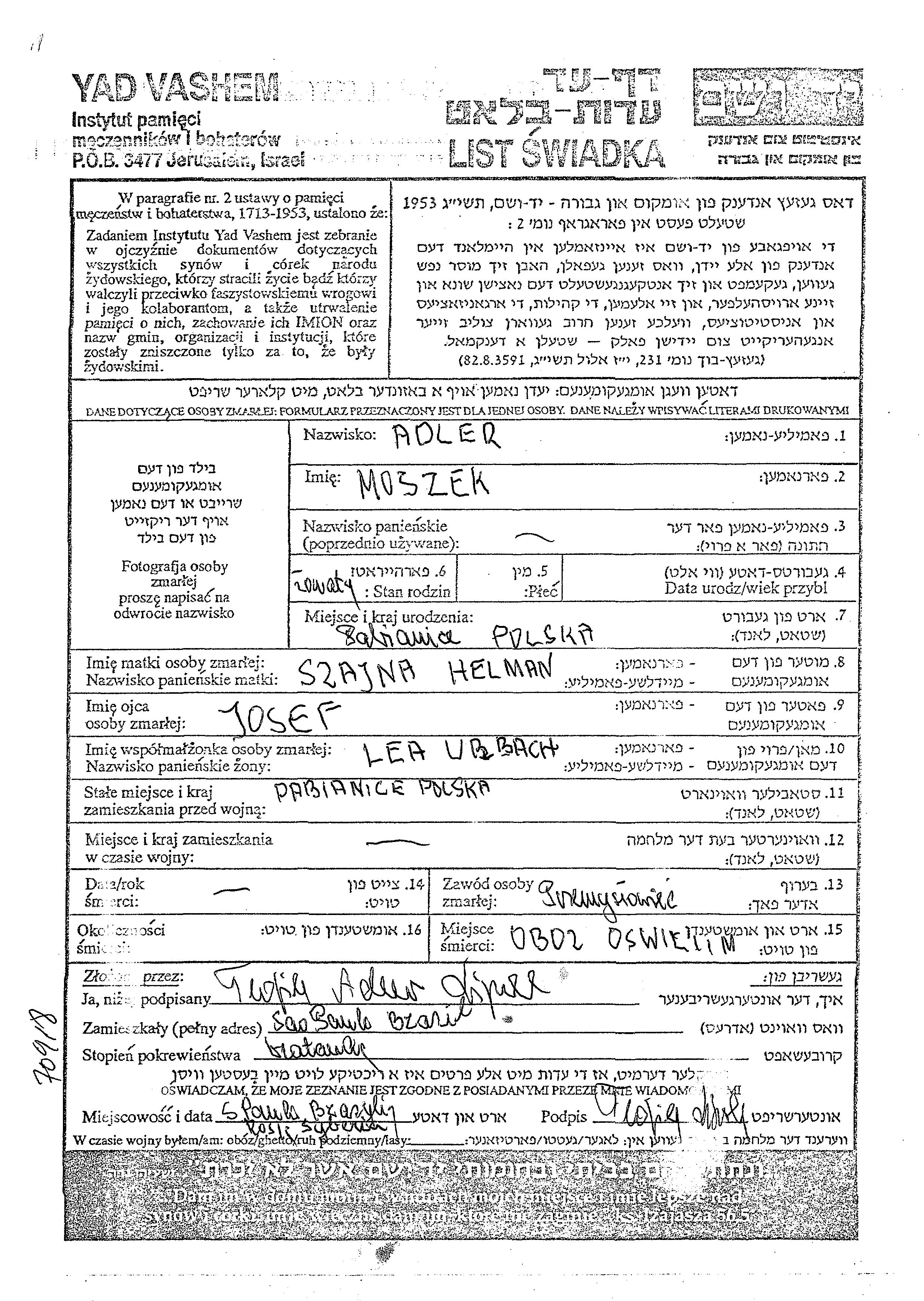 Moszek Adler wurde in Pabianice, Polen geboren. Er war der Sohn von Josef und Szajna. Er war Industrielle/-r und mit Lea Verheiratet. Vor dem Zweiten Weltkrieg lebte er in Pabianice, Polen.