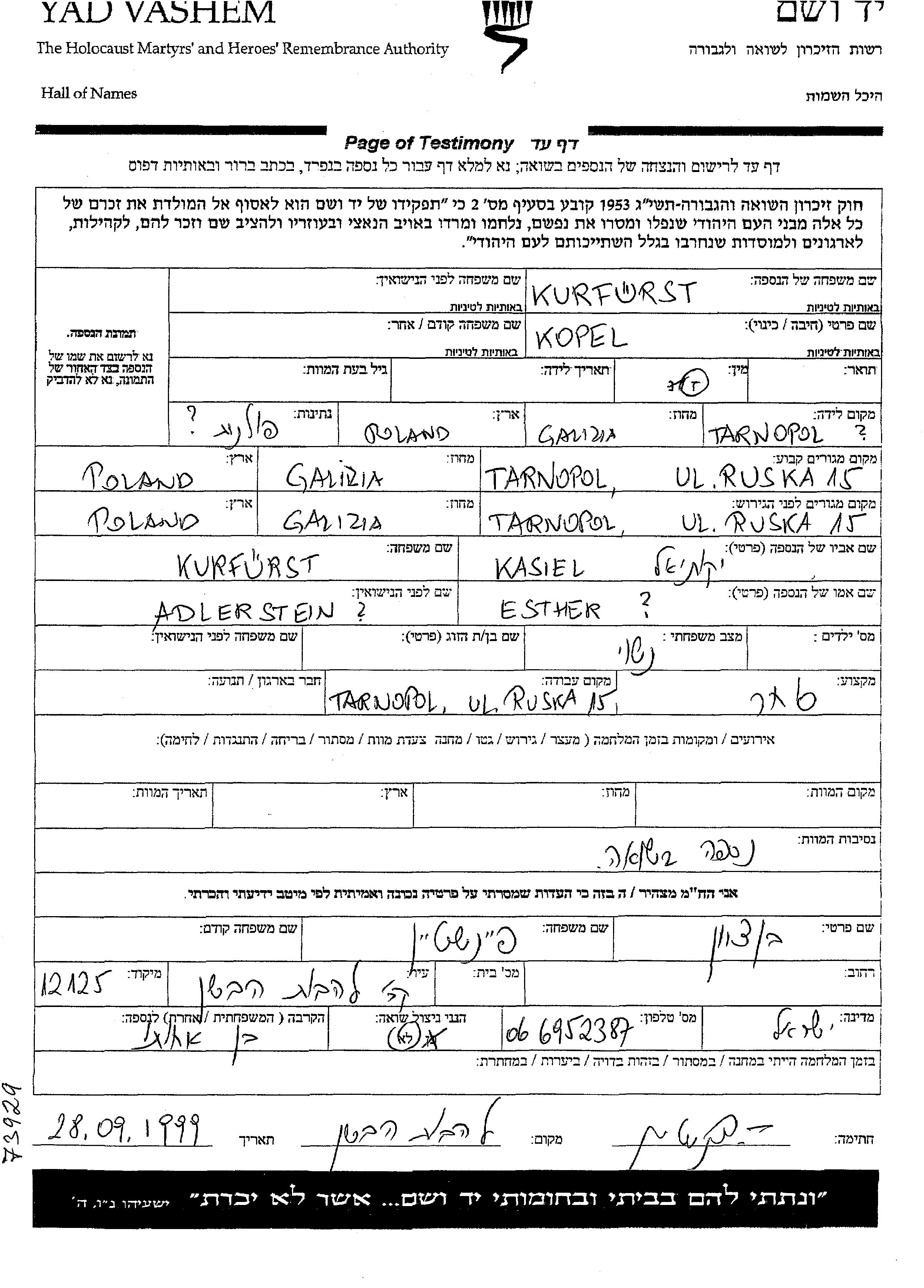 Kopel Kurfuerst wurde in Tarnopol, Polen geboren. Er war der Sohn von Kasiel und Esther. Er war Verheiratet. Vor dem Zweiten Weltkrieg lebte er in Tarnopol, Polen. Während des Krieges war er in Tarnopol, Polen.