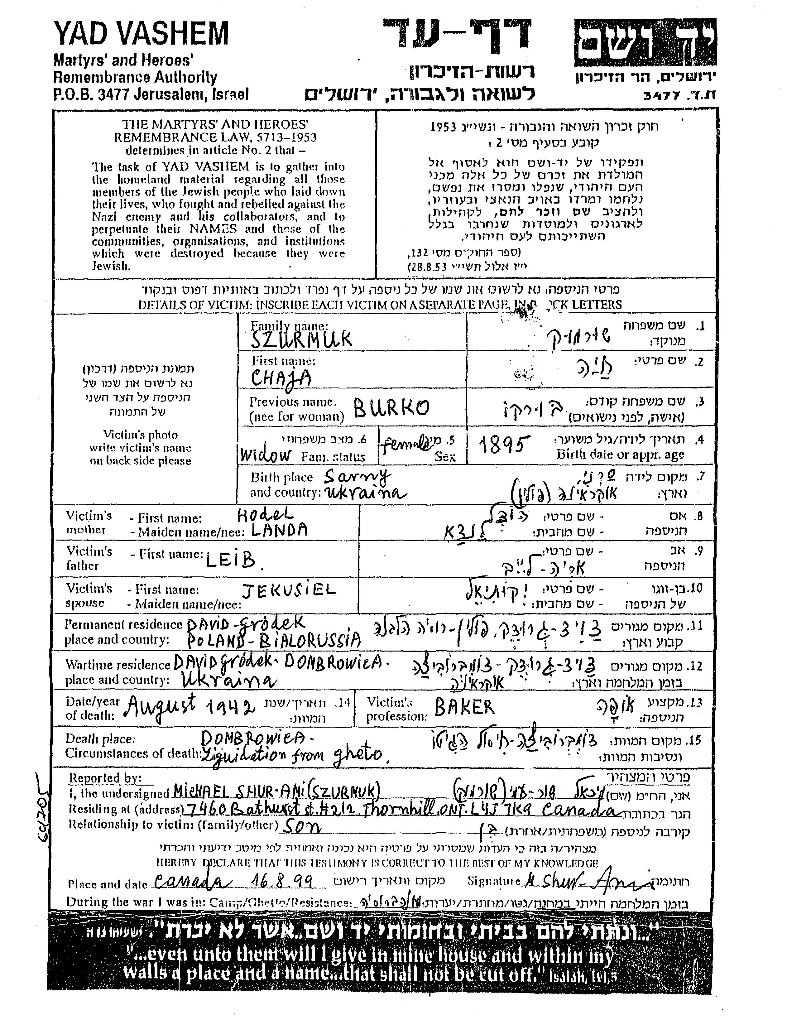 Chaja Szurmuk, geb. Burko wurde im Jahr 1895 in Sarny, Polen geboren. Sie war die Tochter von Leib Arie und Hodel. Sie war Bäcker/-in und mit Jekusiel Witwe. Vor dem Zweiten Weltkrieg lebte sie in Davidgrodek, Polen. Während des Krieges war sie in Dombrowica, Polen.