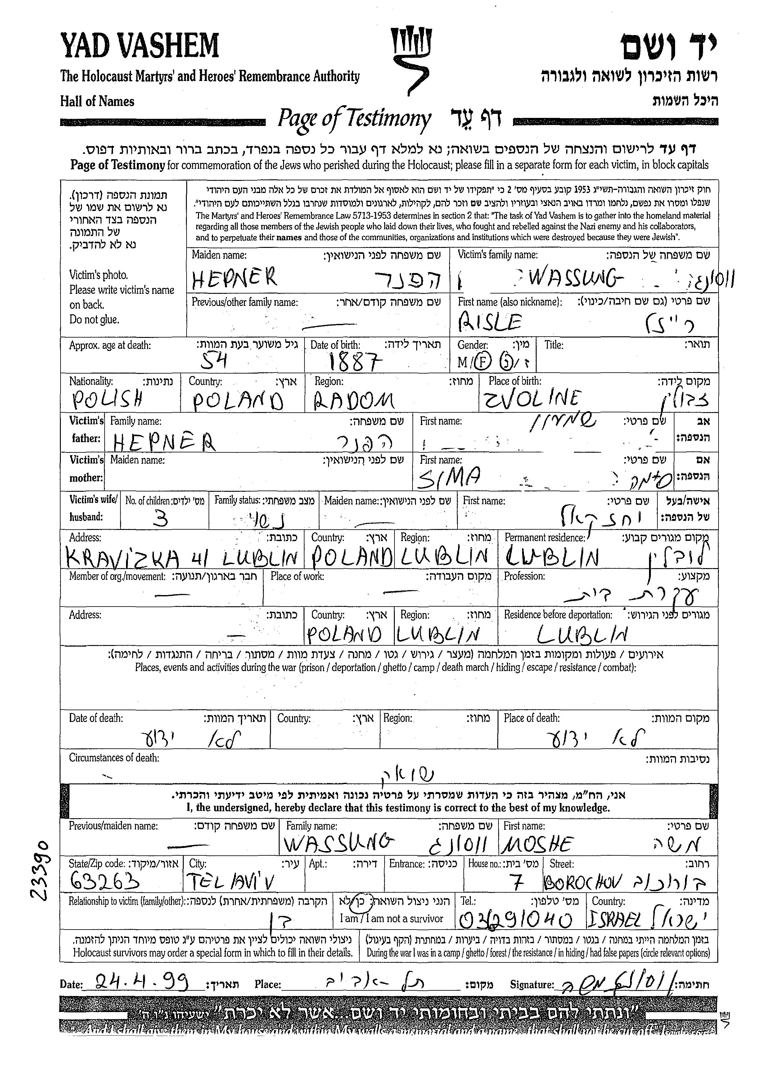Risle Reizl Wassung, geb. Hafner wurde im Jahr 1887 in Zvolin, Polen geboren. Sie war die Tochter von Shimon und Sima. Sie war Hausfrau und mit Yekhezkel Verheiratet. Vor dem Zweiten Weltkrieg lebte sie in Lublin, Polen. Während des Krieges war sie in Lublin, Polen.
