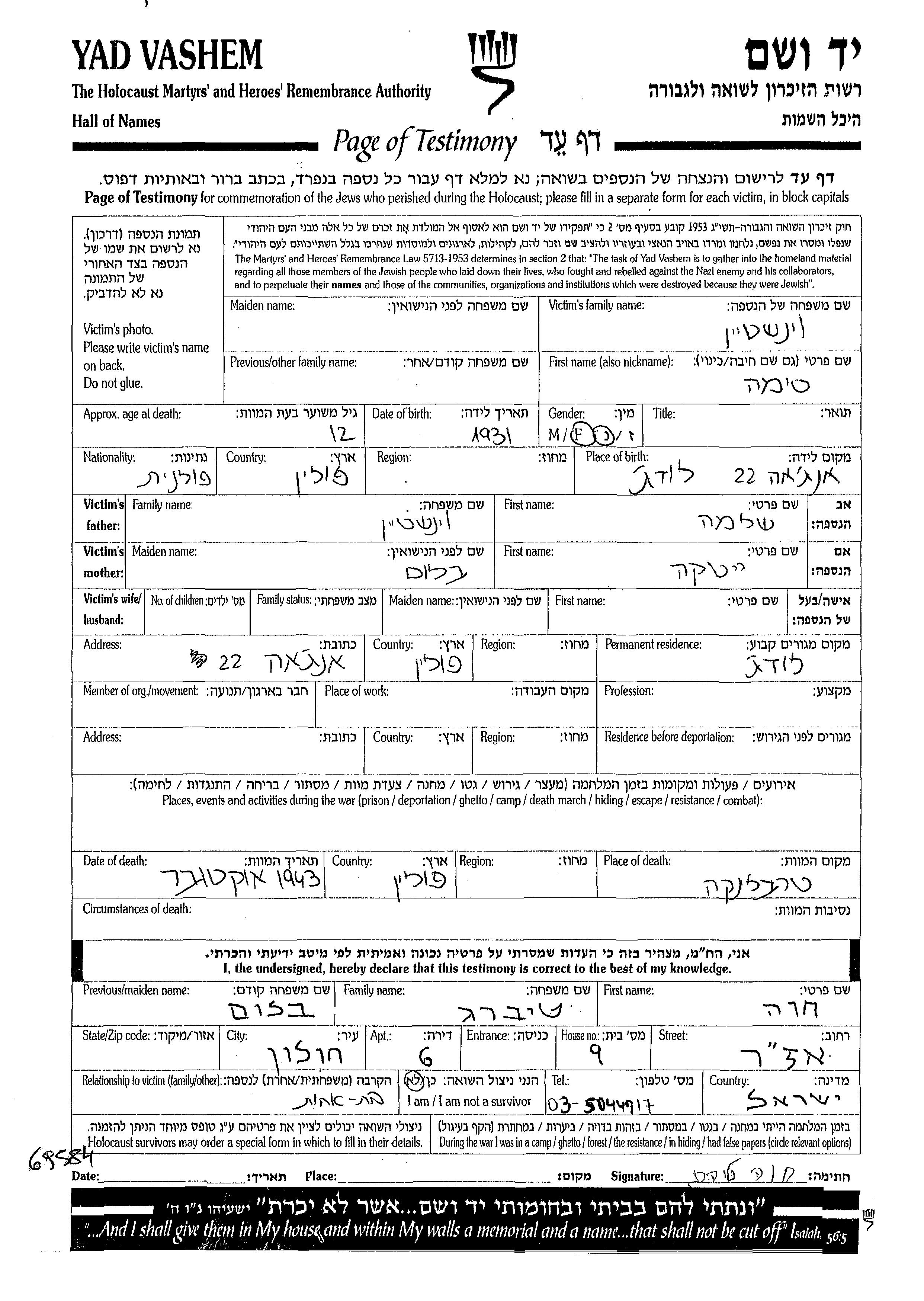 Sima wurde in der Schoah ermordet. Todesort: Treblinka, Polen im Jahr 1943.