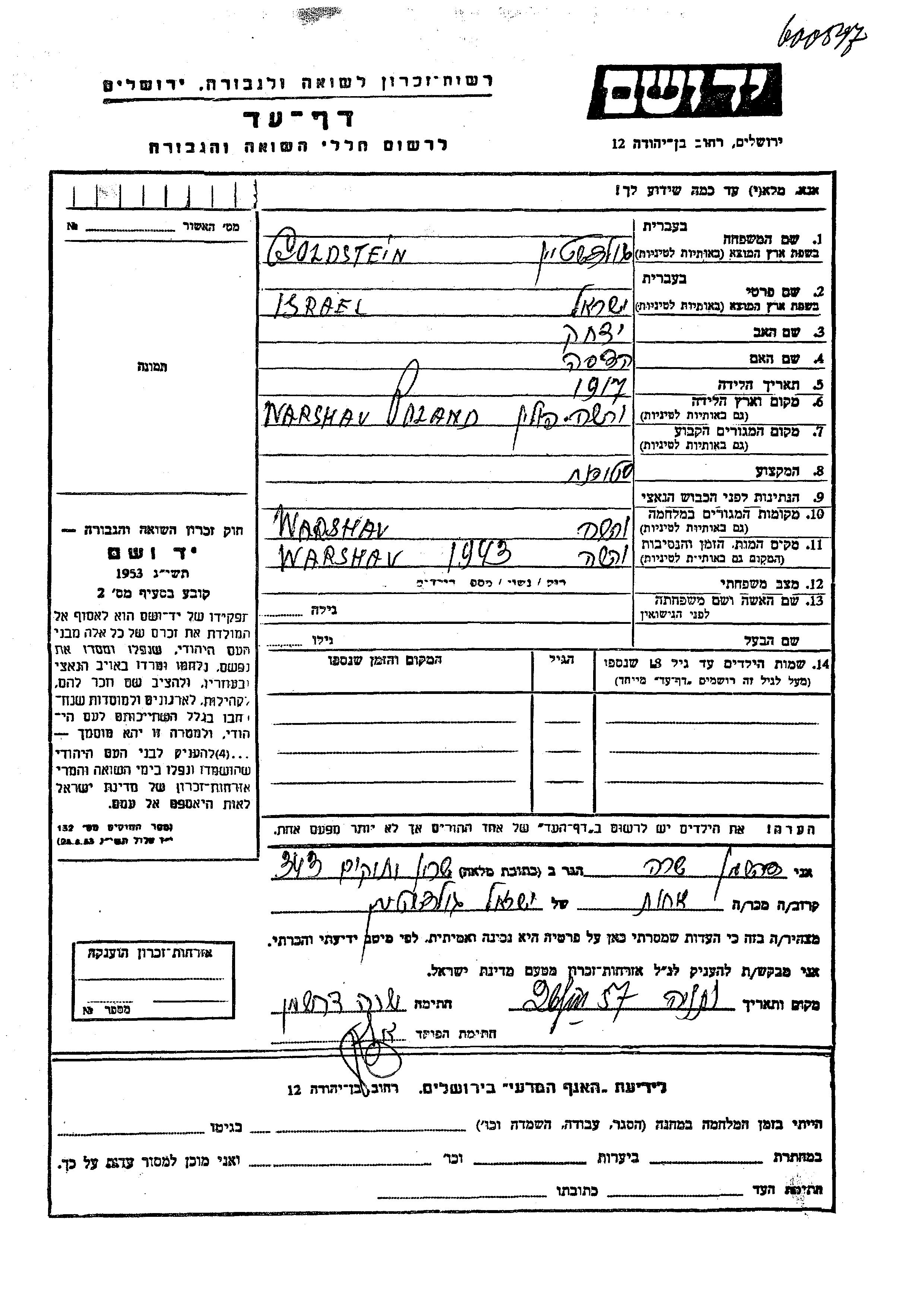 Israel Goldstein wurde im Jahr 1917 in Warsaw, Polen geboren. Er war der Sohn von Yitzkhak und Hadasa. Er war Student. Während des Krieges war er in Warsaw, Polen.